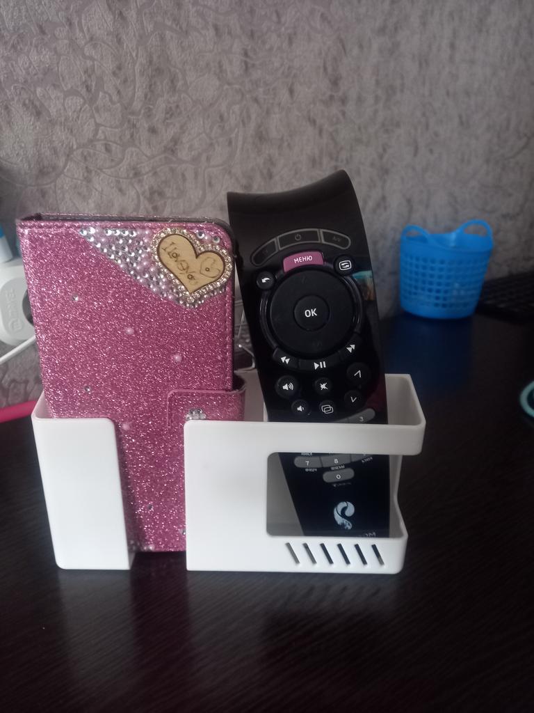 Очень хороший держатель, широкий, телефон в чехле книжки спокойной входит. Есть место под зарядку или пульт! Повешу на стену отлично будет! Вешать лучше на самарезы маленькие чем на скоч, так надёжнее будет. До этого брала меньше размером у другого продавца, телефон в чехле не помещался, да и пульт не любой тоже, к примеру от ростелеком не входит.