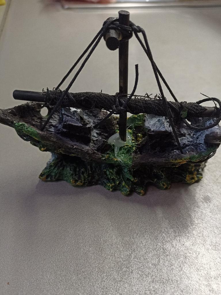 Корабль декорация для аквариума . Симпатичная деталь интерьера подводного мира Купили в подарок племяннику, он увлекается этим делом🦞🐠🐟 Фигурка выполнена материала похожего на пластик. Довольно рельефная. Мачта деревянная, с остатками паруса наверное🤭 к корпусу корабля крепится большим количеством клея. Выглядит не очень симпатично, попробую это исправить. На боковой поверхности есть чьи то инициалы) наверное автора🤣 В целом фигурка неплохая, рыбкам должна понравиться) Доставка около месяца. Кораблик пришел в картонной коробке замотан в большое количество материала похожего на строительный пенофол. Продавец ответственно подошёл к транспортировке, это радует