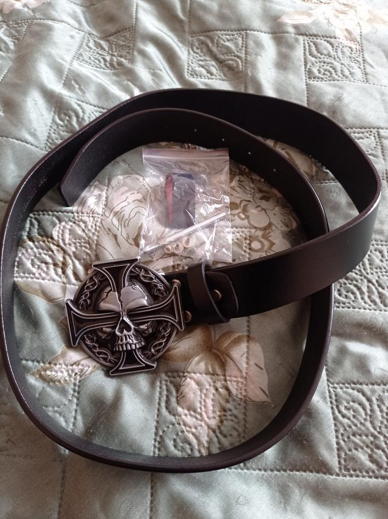 Кожа хорошая. Пришёл в разобранном виде пряжка отдельно, к ней клёпки и хомут для соединения с ремнем, клёпки не винтовые, нужен инструмент. Надо к мастеру идти