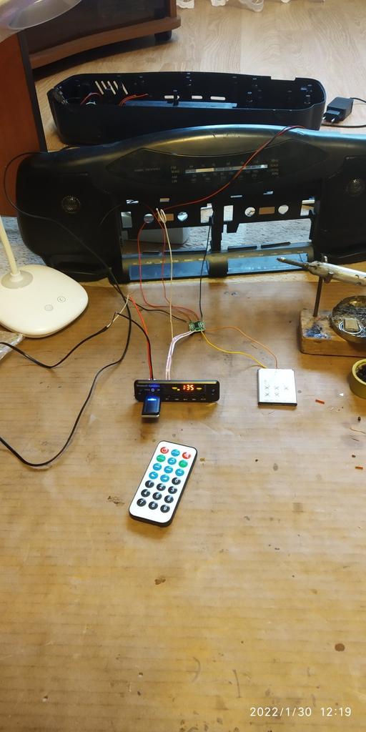 Товар получил быстро, на плате есть место куда впаять антенну и микрофон. Пока не проверял. Прислали усилитель, соберу отпишусь как работает. Ровно месяц доставка. В пульт нужна батарейка 3v. Вроде с виду качественно сделано. Проверил всё работает. Усилитель нужен. Плохо только орёт при включении на всю громкость и когда выключаешь. Ещё нужно придумать чтобы усилитель отключать вместе с плеером питание.