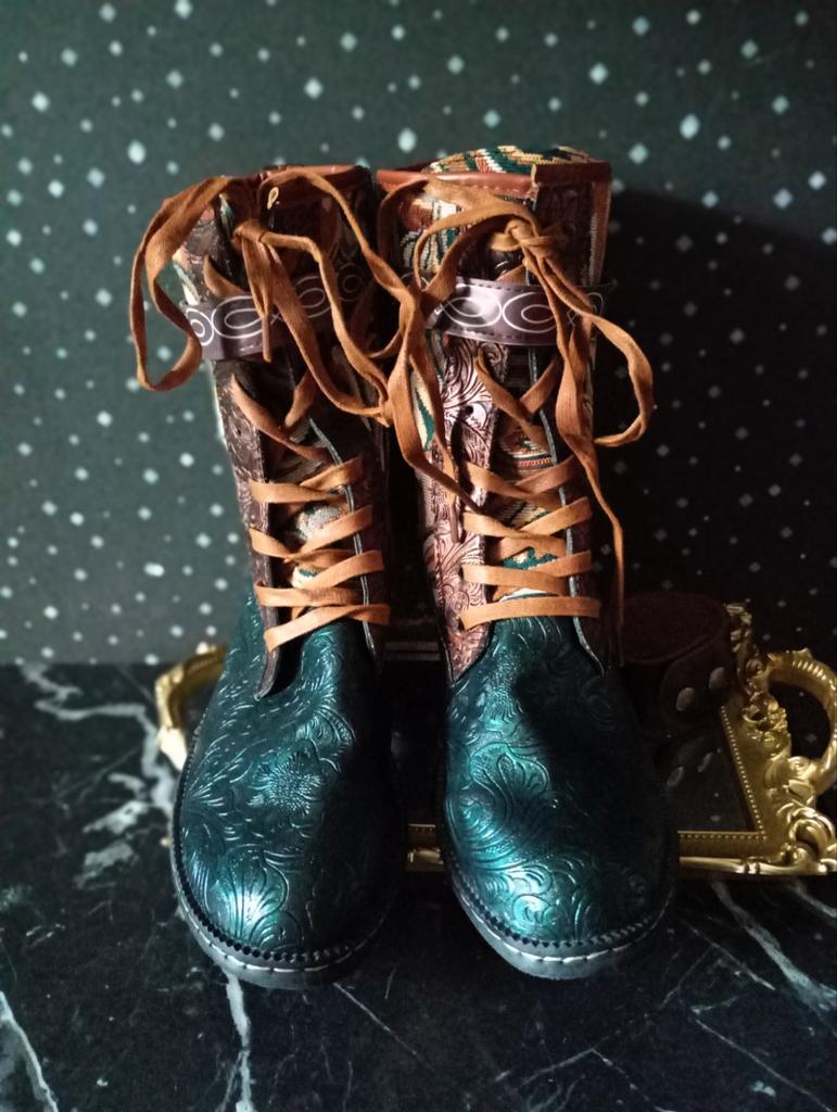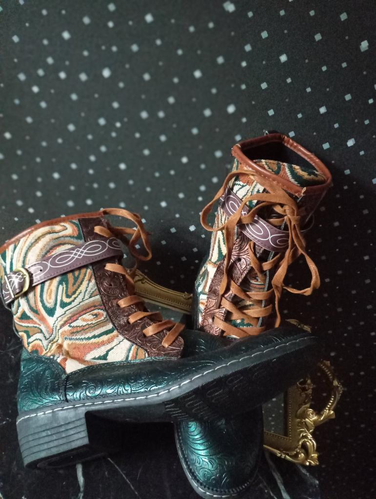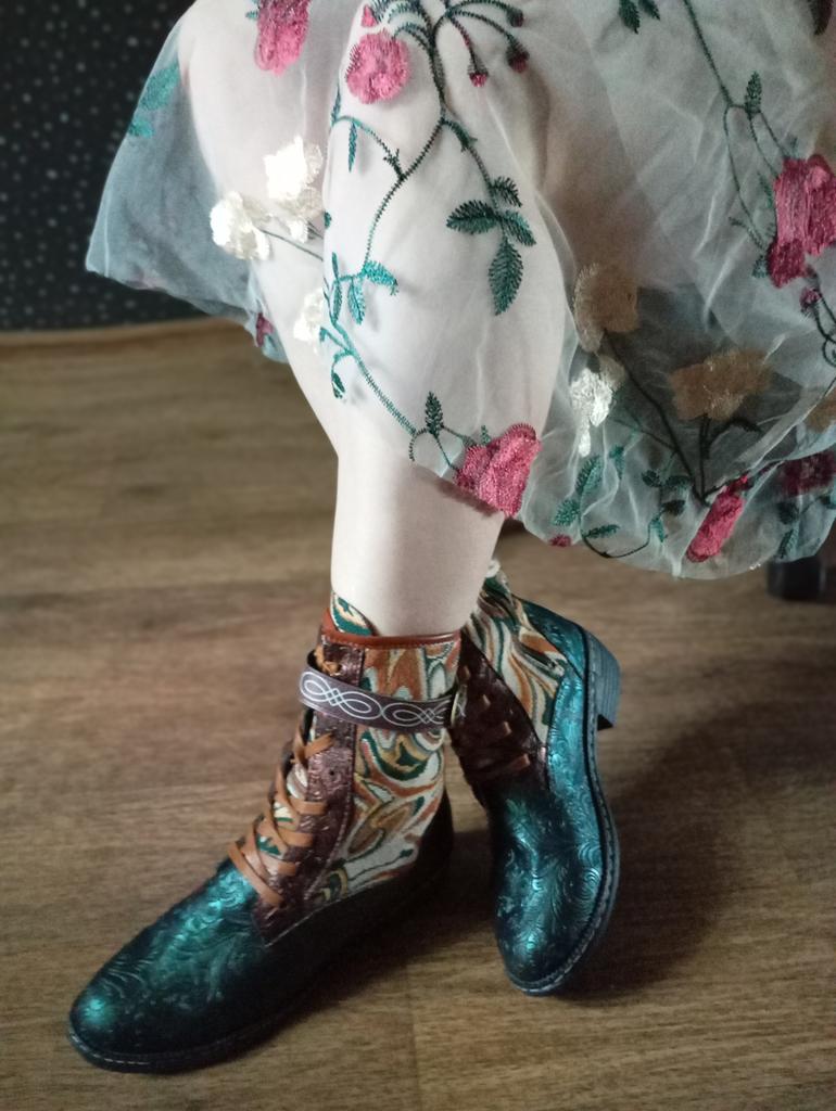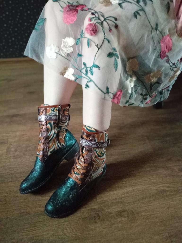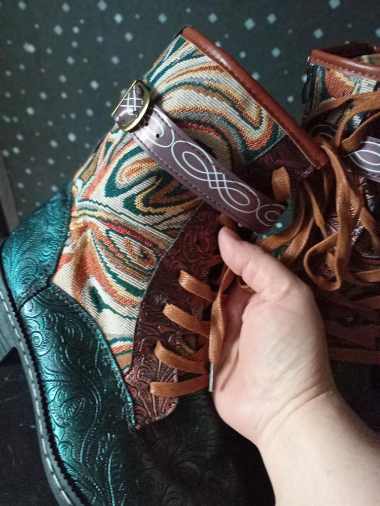 Полусапожки.. Нет, ну никакие они не зимние, конечно...(хотя в названии значится именно так.) Ну, разве что вы живёте где-то в широте Сочи. Внутри тонкая байка. Это, короче, сапоги на осень- весну. И очень хорошие и к тому же красивенные! Они, конечно, не кожаные, за такую- то цену, но выглядят, как кожа, да ещё и с тиснением! Дорого -богато выглядят! Кожа, комбинированная с плотной тканью, типа гобелена. Каблук небольшой, устойчивый и удобный. Шнуровка по всей длине голенища. Надо их зашнуровать под свою ногу раз и навсегда, и будет удобно. И ещё ремешок затянуть сверху, он на пряжке бронзового цвета. А застёгиваются сапоги на молнию 👍 При этом ремешок не мешает. Подошва сапожек вся выложена подковами, на счастье!🤗 Брала 43 размер на длину стопы 26,5. Сели с запасом примерно полсантиметра.