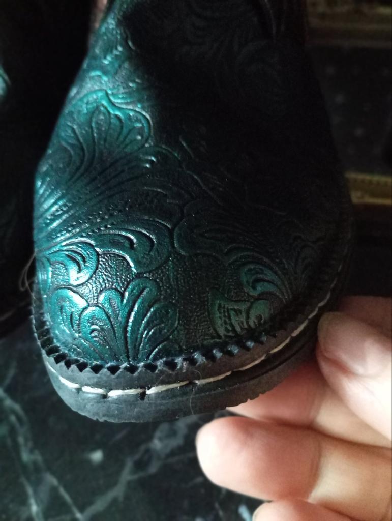 Сапожки, конечно, щегольские - тисненая зеленая кожа (понятное дело, что искусственная) по низу отливает серебром и блестит, как шейка селезня! Колодка удобная, сидит на ноге очень удобно. На мою длинну стопы 26,5 см брала 43 размер - очень хорошо сидит, пальцы не упираются, но и не болтается. У меня еще широкая ступня и высокий подъем. Молния работает хорошо.