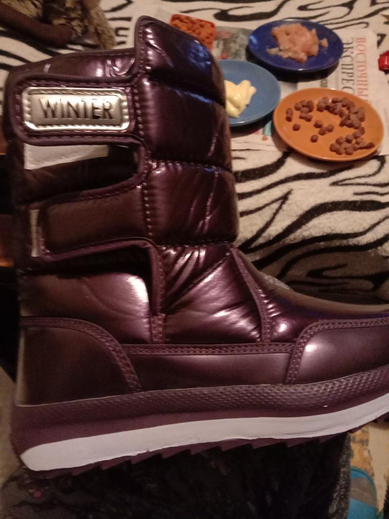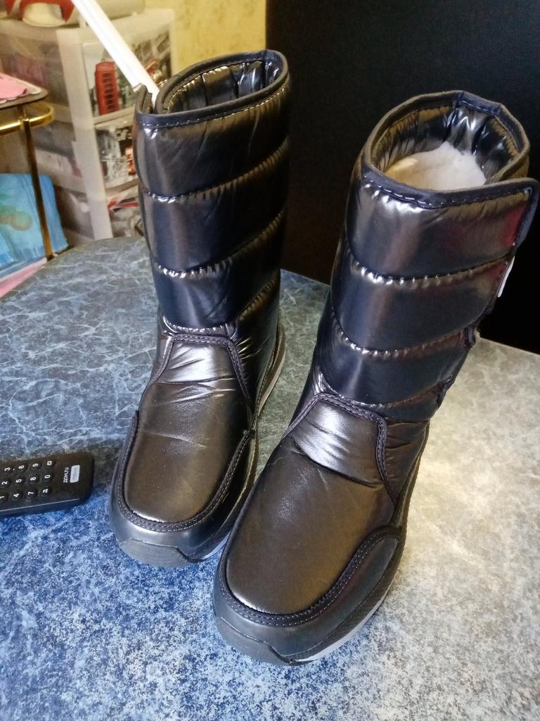 Наконец получила свои сапожки! Точно как на картинке. Для этой цены качество очень хорошее. Строчки ровные, всё дошито, подклеено. Подошва на фото смотрится двухслойной, но на деле белая полоса-это краска. Меня это не смущает.высота от стельки до верха 22 см, окружность по верхнему краю голенища в застёгнутом полностью виде 31 см, если у кого проблемы с ногами, то липучками ещё сантиметра на 3-4 можно расставить. Пока новые по ширине стопы в области"косточки" обжимают сильно, но думаю разносятся. Лёгкие, удобные. На 37 р-р взяла 38-самое то. Я толстые носки зимой не одеваю, так что запаса на носок хватит. В целом сапожки понравились. Похожу, посмотрю на сколько скользкие будут-напишу. Сегодня прошлась по морозцу небольшому, минус 13, не скользят. Рекомендую к покупке.