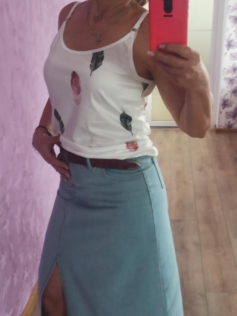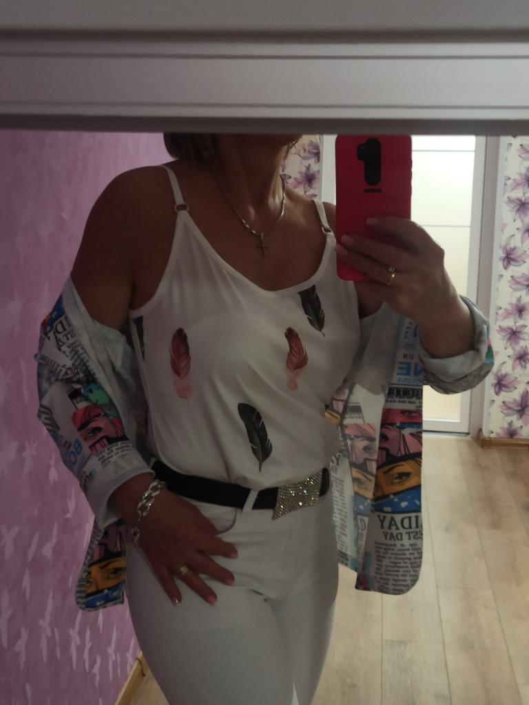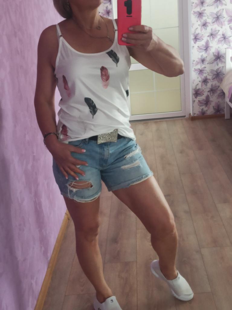 Топ с принтом. ⭐⭐⭐⭐⭐ --- Приветики всем!😉✌️ Идеальный топ как под жакет или рубаху так самостоятельно можно носить. Летняя майка с принтом разноцветных пёрышек! Мягкая приятная к телу! 👍 Ткань по составу полиэстер, но на бирке указано что cotton 35%,polyester 65%. Утверждать не стану! Трикотажное полотно мягкое, эластичное и хорошо тянется! Брители не регулируются! Заказала размер М На параметры ог-90,от-76, об-99 и рост 165см майка села свободно! Можно было смело покупать на размер меньше! S - ка была бы идеально, но сама виновата ! Изделие качественное и соответствует промфото продавца! Покупкой очень довольна! Рекомендую! Спасибо большое продавцу ❤️😘 Спасибо JOOM ❤️😘