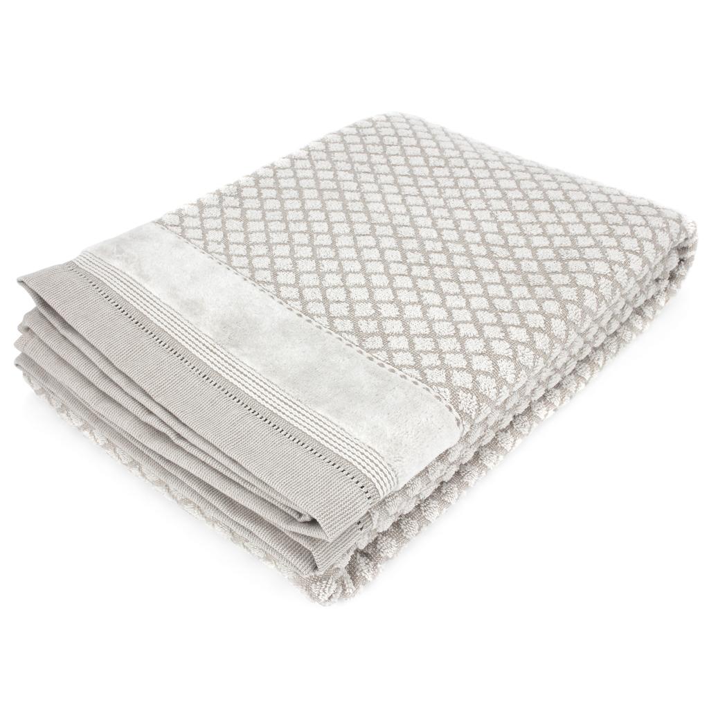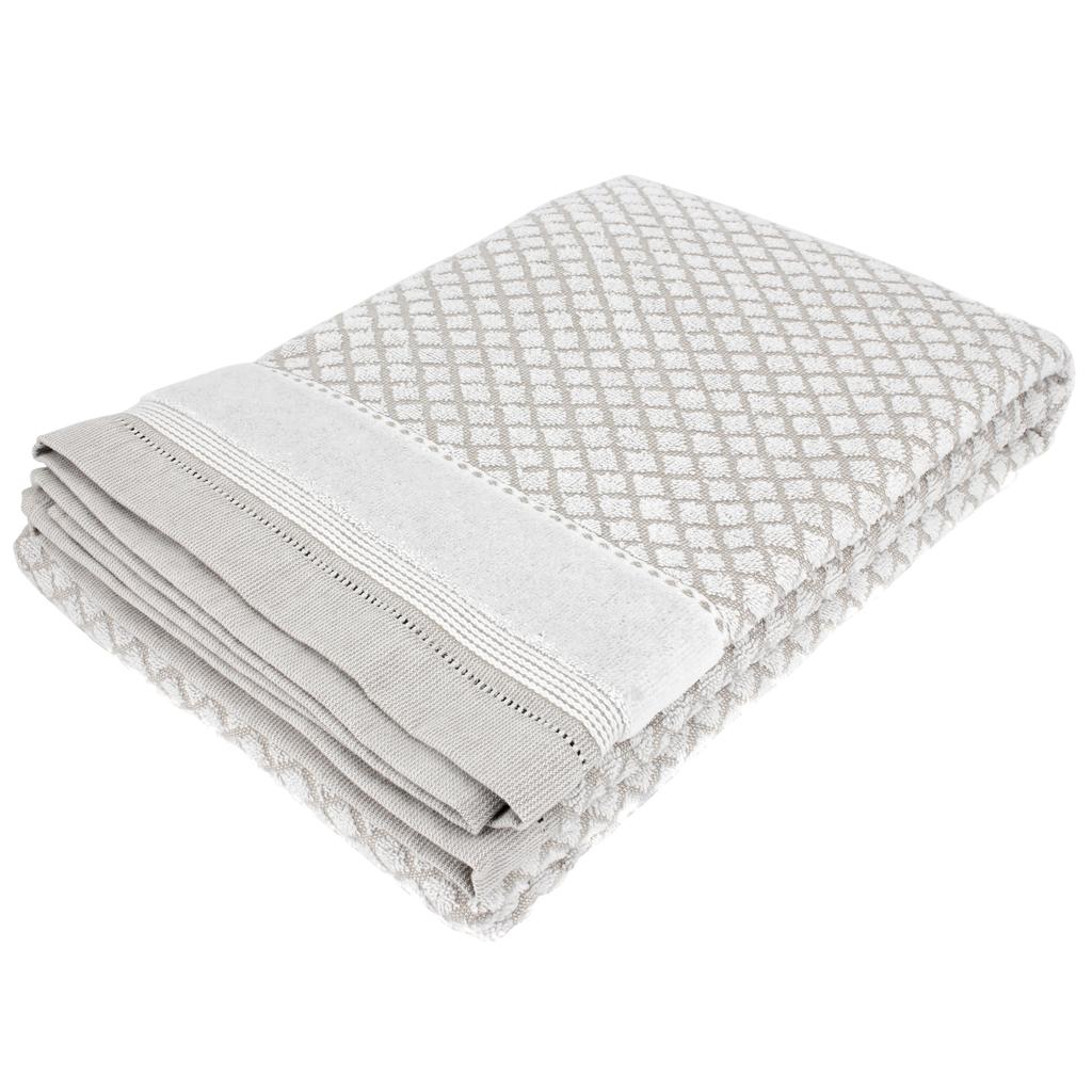 Optez pour des motifs géométriques avec ce linge de bain LINEN avec sur une face des motifs ciselés en petits croisillons, finition bande velour et liteau jacquard avec jours échelle (point ouvert) et sur l'autre face éponge bouclette uni déclinée dans une ambiance beige.