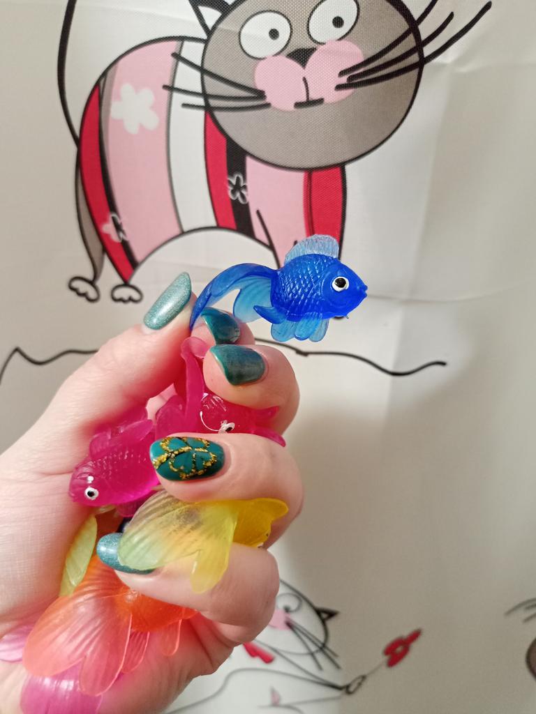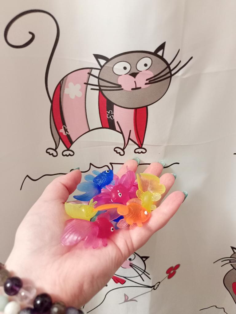 Рыбки целые, яркие, красивые, только из заявленных 10-ти, к нам доехали всего 9. Упакованы хорошо, вряд ли потеряли, скорее всего недосчитали изначально. Ожидала более разнообразных, в итоге 6 рыбок розовых, 2 жёлтые и одна синяя 😏 И к тому же есть запах, не критично, но присутствует. В целом конечно норм, малышка заценила, в ванной играет, разбрасывает, собирает. Но осадочек остался, как говорится 🙃