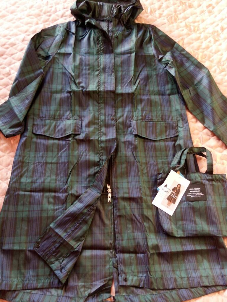 Сшито качественно!прям супер-качественно! Замок-молния кнопочки, крой модели на "отлично"! Материал... это вроде даже не плащевка... больше похоже на клееночку в весёлую сине-зеленую клетку. Будем ждать дождь! Проверить нужно. Сумка для плаща - огонь!
