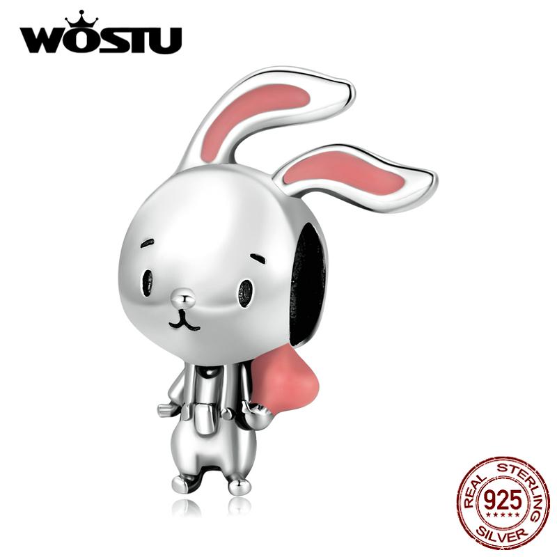 WOSTU Бусины из стерлингового серебра 925 пробы с изображением животных, милый энергичный кулон в виде кролика, подходит для оригинального браслета, ожерелья, ювелирные изделия своими руками
