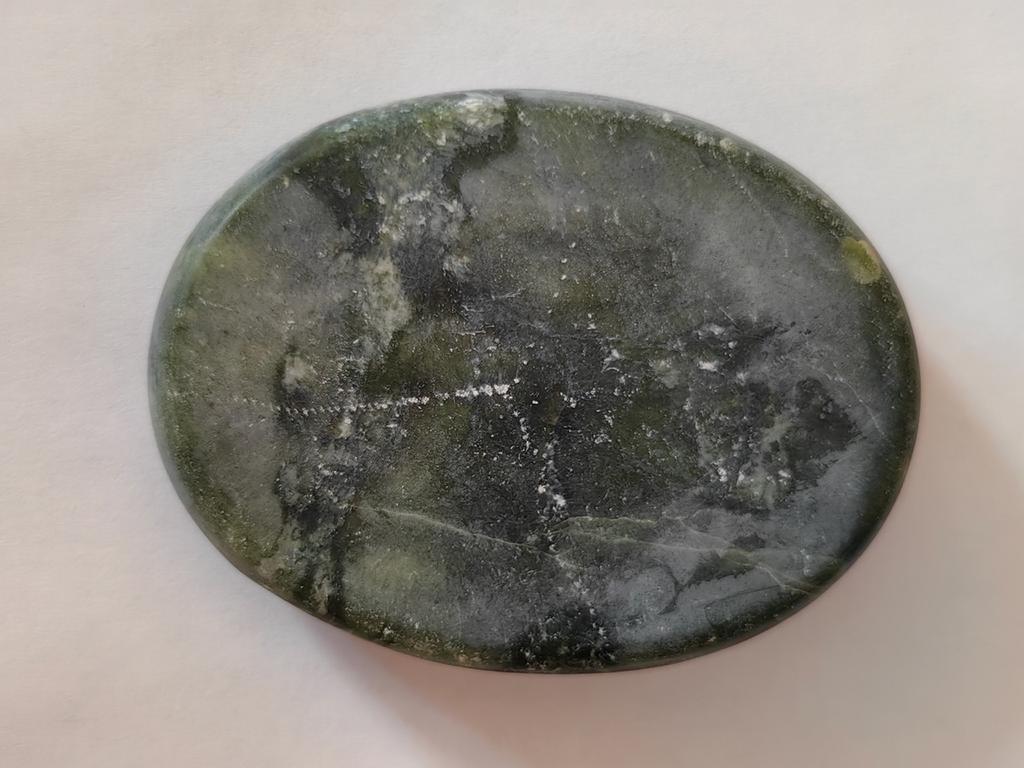 Это не нефрит!!! Обычная алевролитовая галька; царапается гвоздиками и бытовыми ножницами. Фонарём не просвечивается, и рисунок не нефрита.
