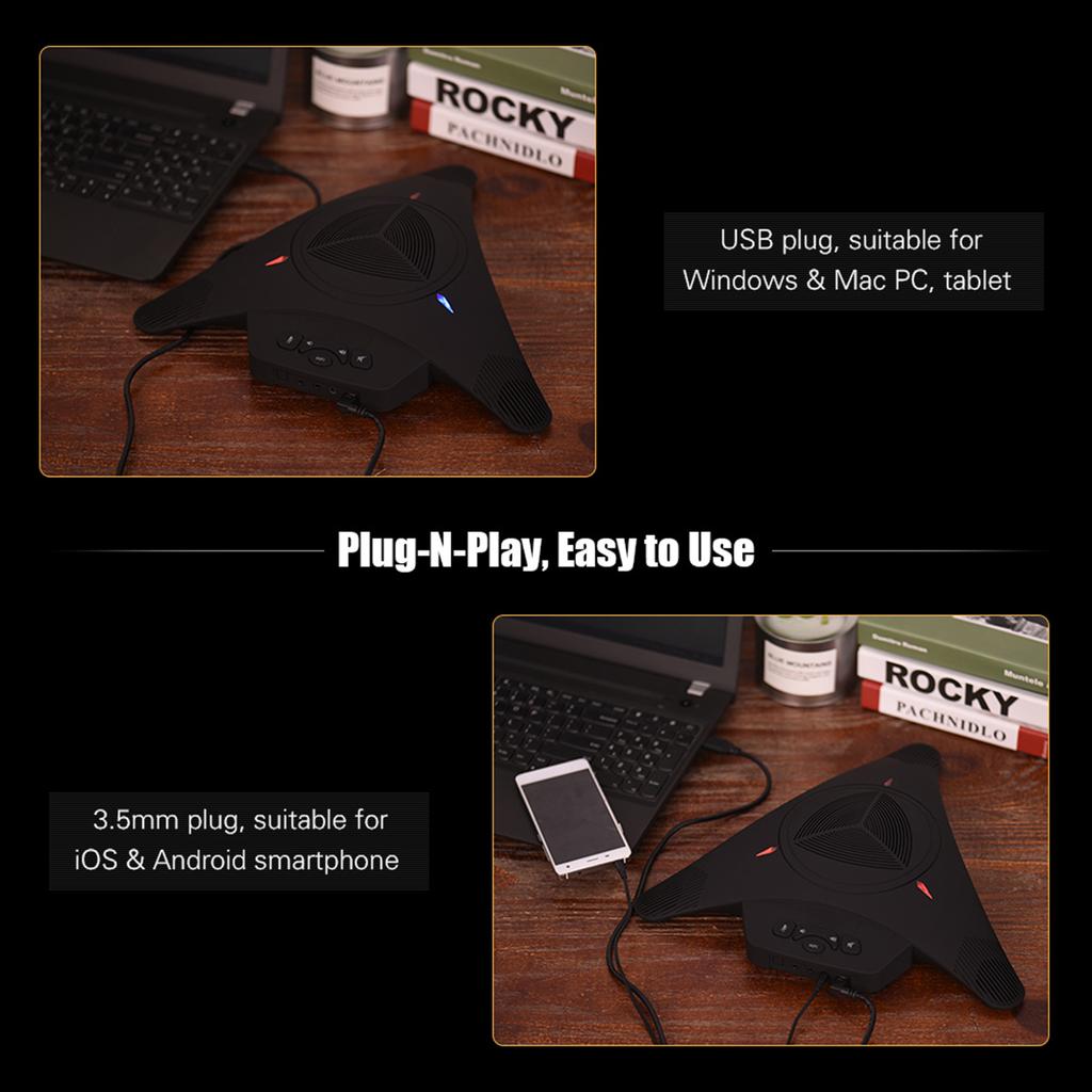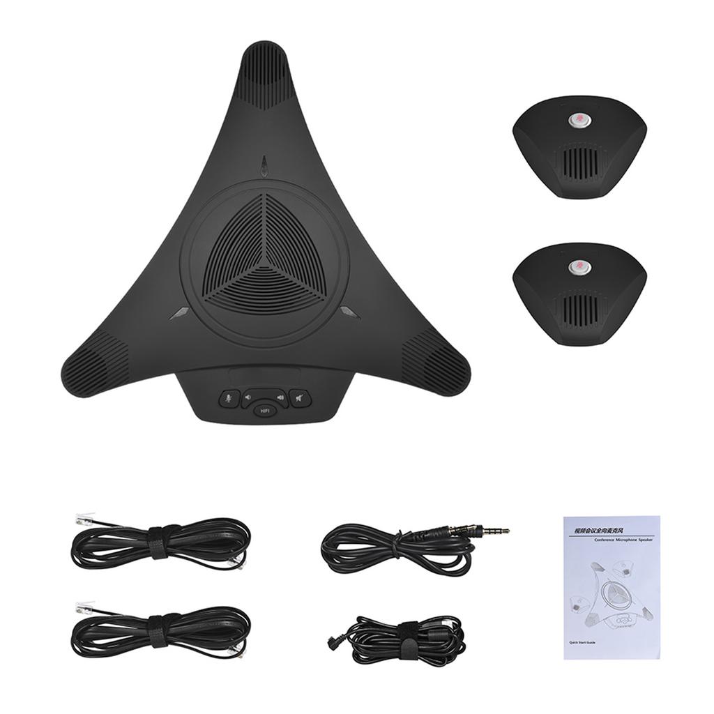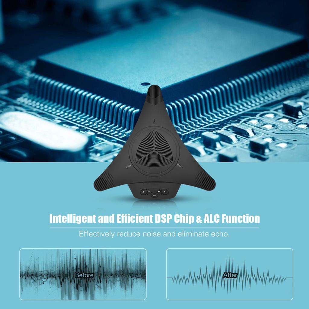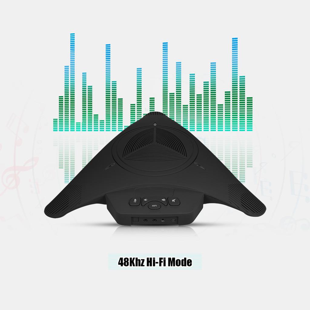 Три встроенных однонаправленных микрофона с двойным конденсером, улавливают кристально чистый звук от 360 градусов в пределах 8 м. Два удлиненным микрофона предназначены для длинных конференц-столов.