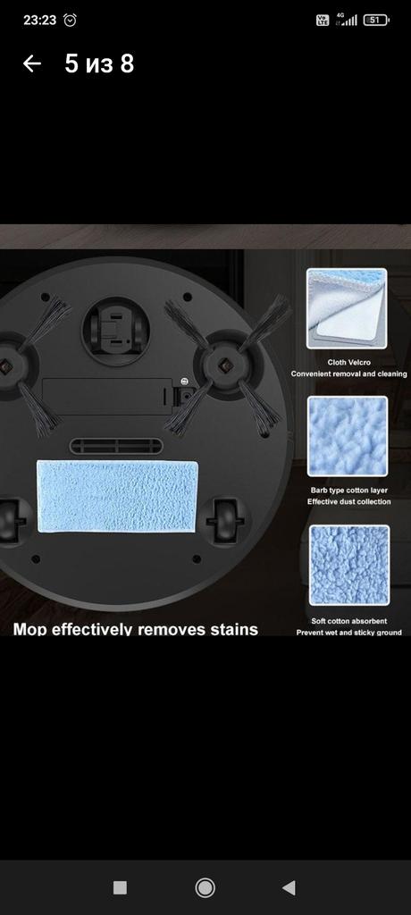 Маленький робот пылесос... собирает только пыль, а мусор разметает в разные стороны. Не рекомендую. Неполная комплектация. Нет ручной щетки. На картинках изображен по размеру больше пылесос... это видно по фото вид снизу...