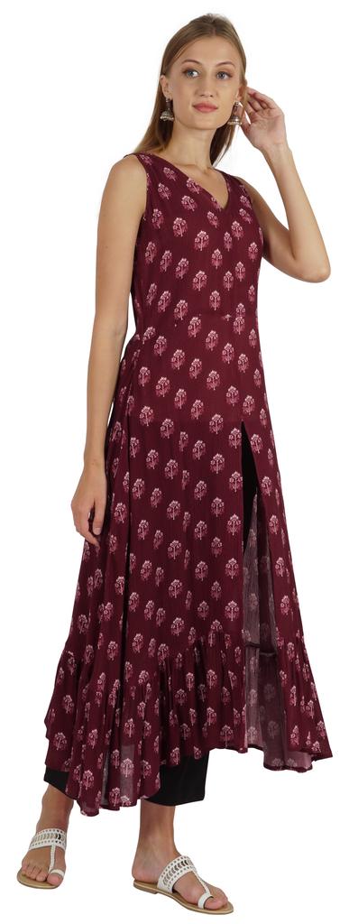 Этот прекрасный дизайнер Курти от Phagun для женщин с лучшими дизайнами и образами.. Этот привлекательный курти изготовлен из очень удобной ткани для повседневного использования и любого случая.. Выглядит традиционно, потрясающе и красиво. Он отличается непринужденным стилем, принтованным рисунком, v-образным вырезом, без рукавов, разрезом спереди, расклешенной куртой А-силуэта, прямым подолом.