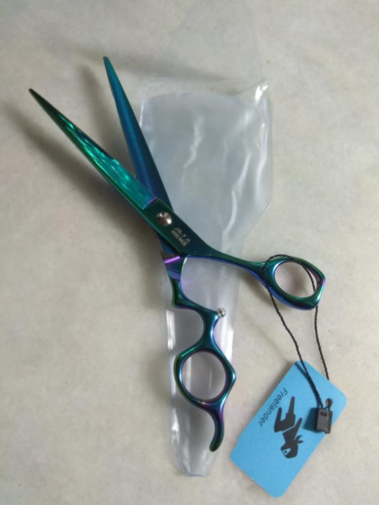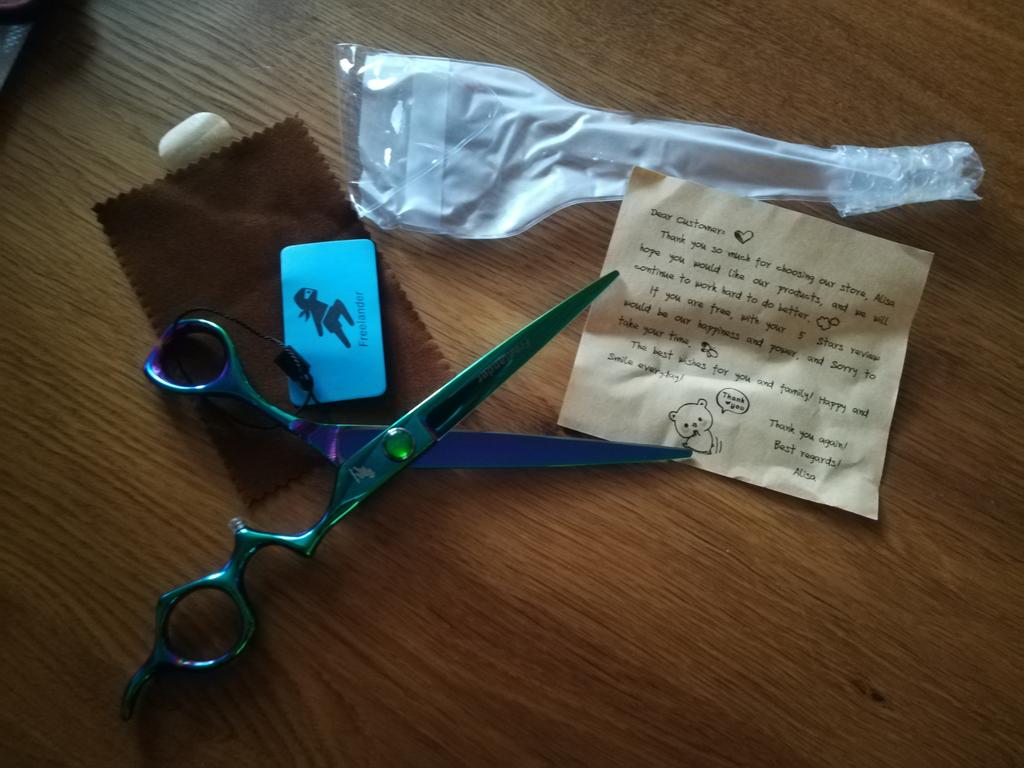 Парикмахерские ножницы (профессиональные) Нержавеющая сталь Эргономичные Размер: общая длина:19.7 см Рабочая длина лезвия: приблизительно 9.0 см Вес: 83 грамма Зажимной винт для регулировки хода лезвий Цвет: зелёно - синий ( хамелеон ) Заточка: очень острые. Лично нам, визуально ножницы понравились. Интересная заточка. Муж приятно удивился и оценил качество самих ножниц. Удобный затяжной винт. Сами ножницы для моей руки тоже очень удобные. Приятное дополнение к ножницам - это замшевая салфетка цвета кофейных зёрен и записка прописью на латинице ( позже попробую перевести). Как-то сразу всё стало родным и уютным. Отдельное за это спасибо от чистого сердца 💖 Спасибо большое дизайнерам, всем работникам производства и продавцу. От нашей семьи респект 👍👏 Также, как всегда, спасибо Джуму и службам доставки 🌹 Всем добра и мира.