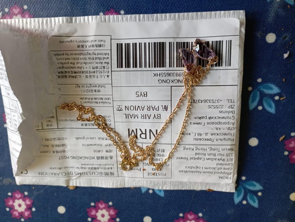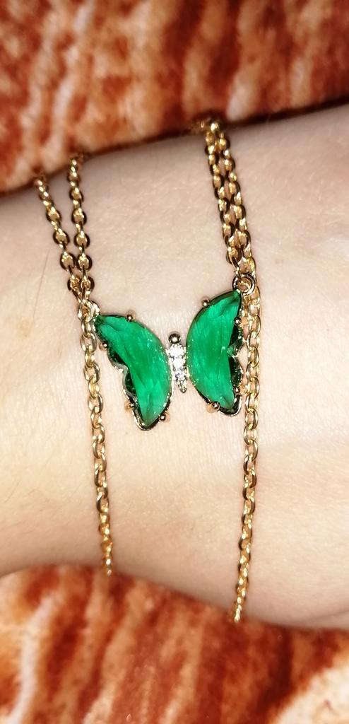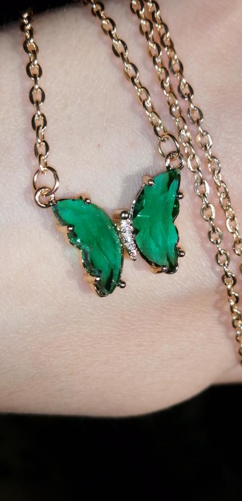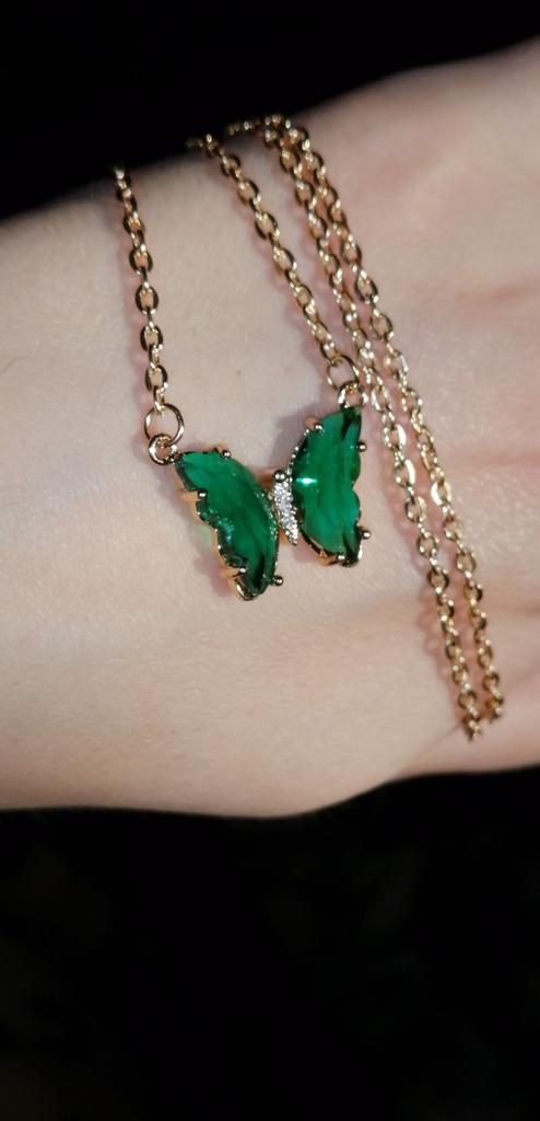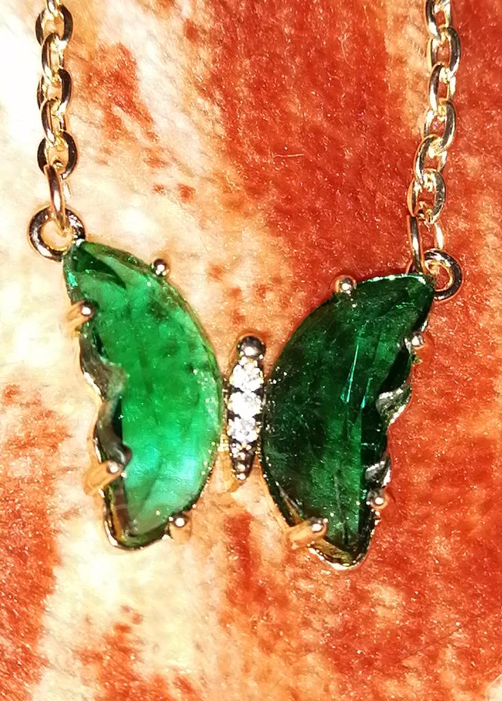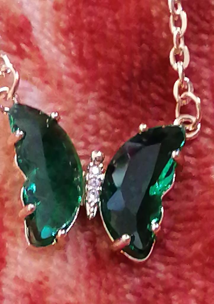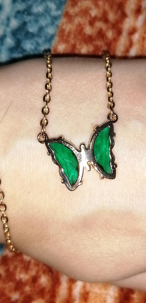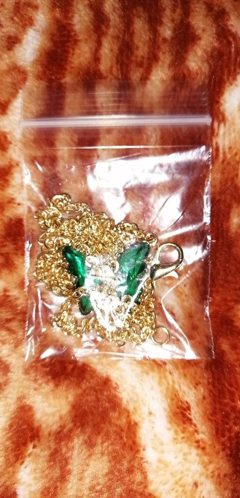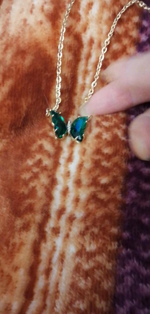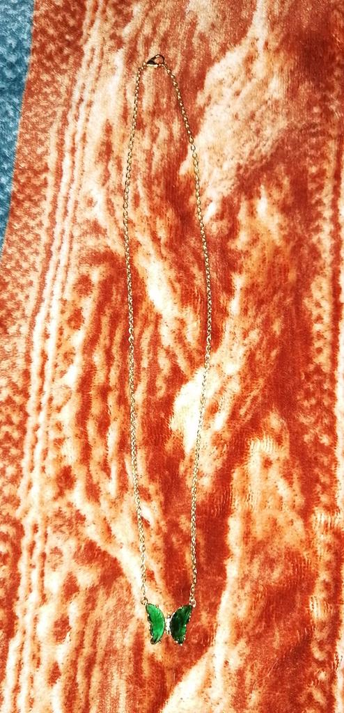 Подвеска - бабочка 🦋, зелёного цвета. Смотрится красиво и мило. Цепочка под золото, довольно длинная, с карабином. Подвеска увесистая. Всё, как на фото продавца. До СПб посылка шла ровно месяц на почту. Спасибо продавцу и Джум!