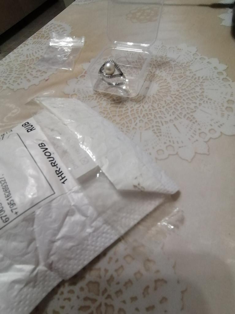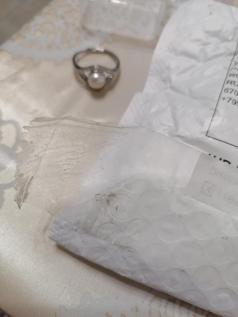Пакет с товаром, видимо, вскрывался, т.к. был сверху заклеен обычным скотчем. Такой упаковки у товаров Джума не бывает. По поводу речного жемчуга тоже сомнения. В описании указано, что размер жемчуга 8-9 мм. В моем кольце жемчужина маленькая, её размер не дотягивает даже до 7 мм.