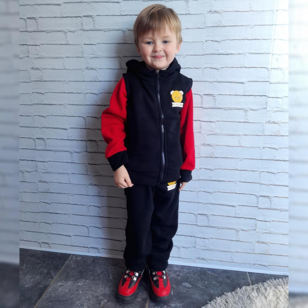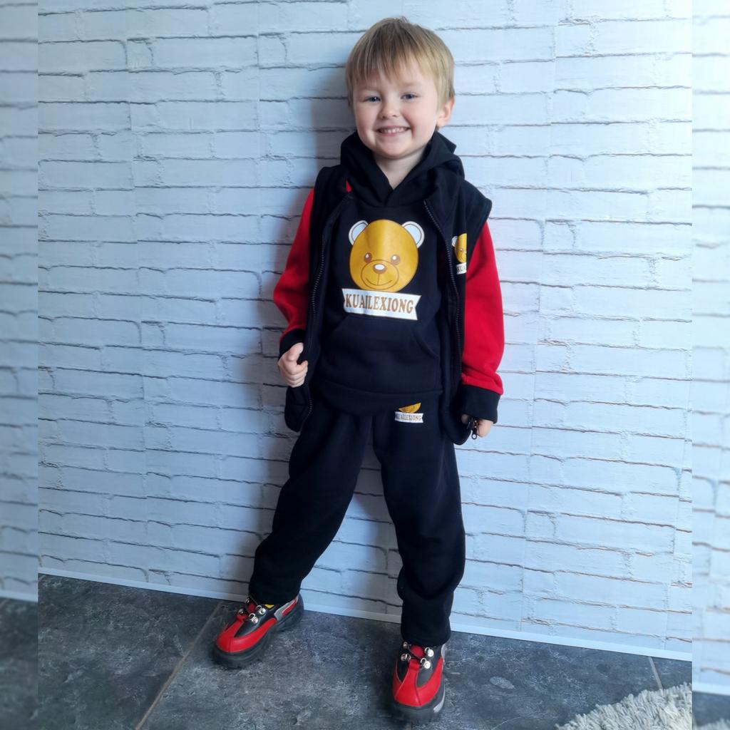 Тёплый детский костюм-тройка 🐻 +промокод на скидку 5%🏷️ Беру подобные костюмы сыну каждый год. Симпатичный, тёплый, мягкий и уютный вариант на осень, зиму и весну. Костюм состоит из 3 частей: кофта с капюшоном, штаны и жилет. Кофта без каких-либо молний и пуговиц, но с капюшоном. Одевается через голову. На рукавах и внизу манжеты - резиночки. Посередине на животе большой карман - кенгурушка. Штаны прямого кроя. На талии держатся на резинке. Манжетов и карманов нет. Жилет на пластмассовой молнии. Без капюшона. Без карманов. Можно носить костюм, как с жилетом, так и без, как с кофтой, так и без неё, как кому удобно. 👌 Из нюансов только материал- это 100% полиэстер, а значит стирать только при 30-40°С, иначе появятся катышки. Многие пишут, что он скрипучий, плохой, ещё что-то, но знаете, я не заметила, сын тоже, а он очень привередлив к тактильным ощущениям от одежды. ☝️ Верхняя ткань в рубчик. Тянется. Изнутри - мягчайший флис. Наклейка также не высшего качества, но и про стоимость комплекта забывать не будем. Я стирала уже 2 раза при 30°С костюм, пока все в таком же состоянии, как и был. 👌 Размер взяли 120 на сына 4 лет с ростом 102 см. Подошёл хорошо, немного с запасом. Думаю, до 110 см, максимум. Поэтому смело можно брать на 2 размера больше, чем нужно. Доставка до Алтайского края месяц живым треком. Этикетки, ярлыки на месте. 🏷 Знаете, дети растут быстро, а несколько сезонов и такой комплект прослужит. Тем более для прогулок осенью и весной - это просто идеальный вариант! От меня 5 звёзд, но выбор, конечно, за вами. 😉 Промокод на скидку 5% - A0SQL6ZJ0J 🏷️ Действителен, пока горит красным. 💥