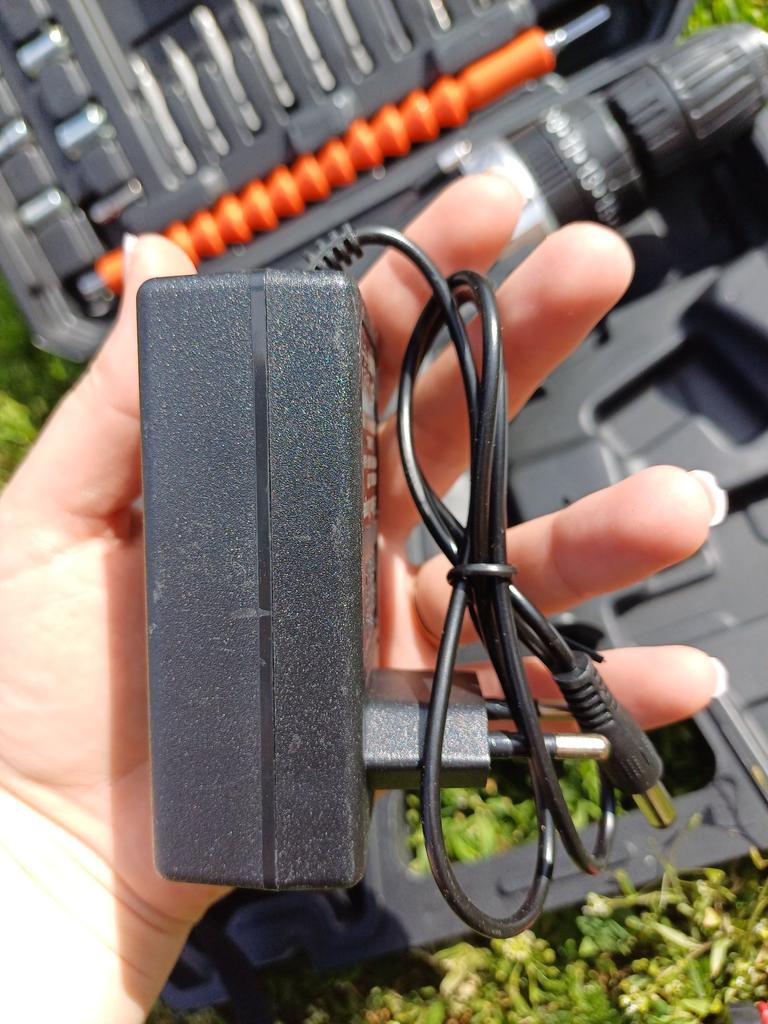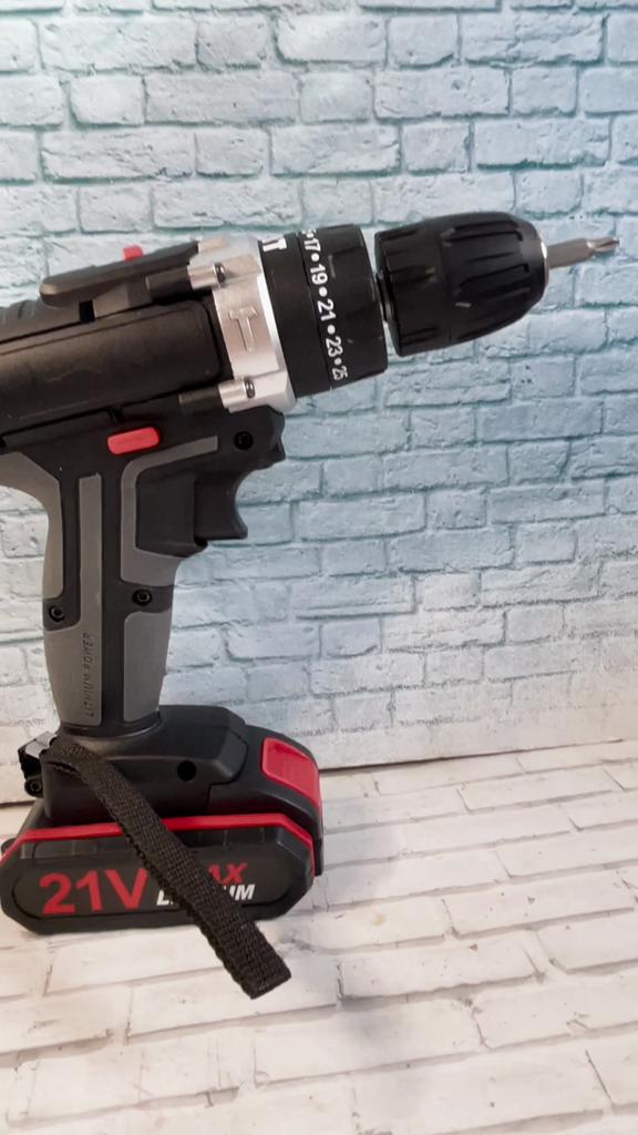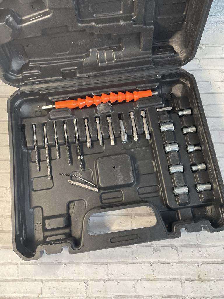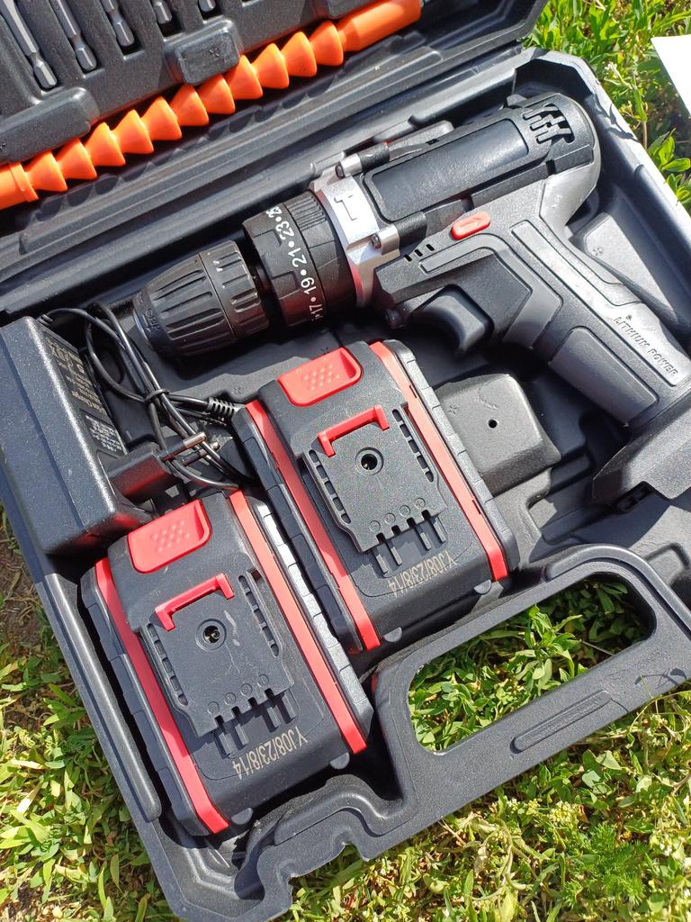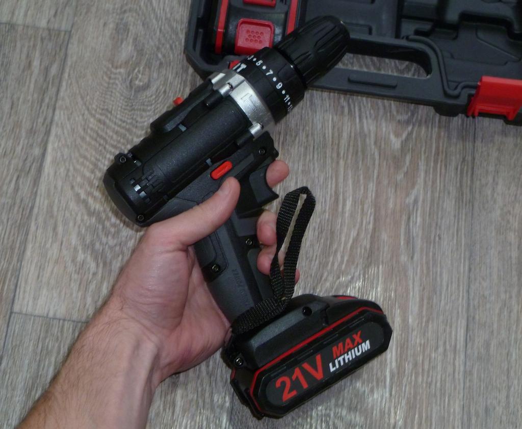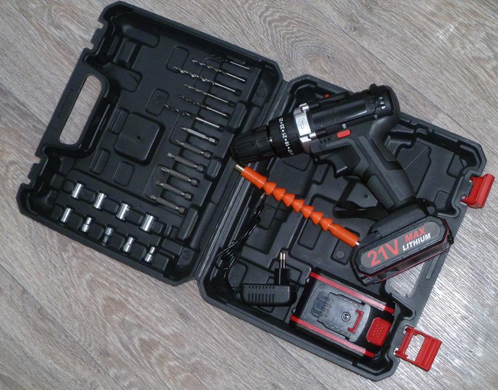 Шуруповерт ударный в кейсе. Дрель-шуруповерт с функцией удара, с набором инструмента (сверла,биты,головки). Пластиковый кейс защищает от пыли при хранении, набора инструмента хватит для домашних работ. В комплекте 2 аккумулятора 21 в, зарядное устройство с европейской вилкой, сам шуруповерт имеет прорезиненные части от соскальзывания из рук. Режимы работы: ударный режим для работы с твердыми материалами и стандартный режим для сверления и закручивания шурупов.