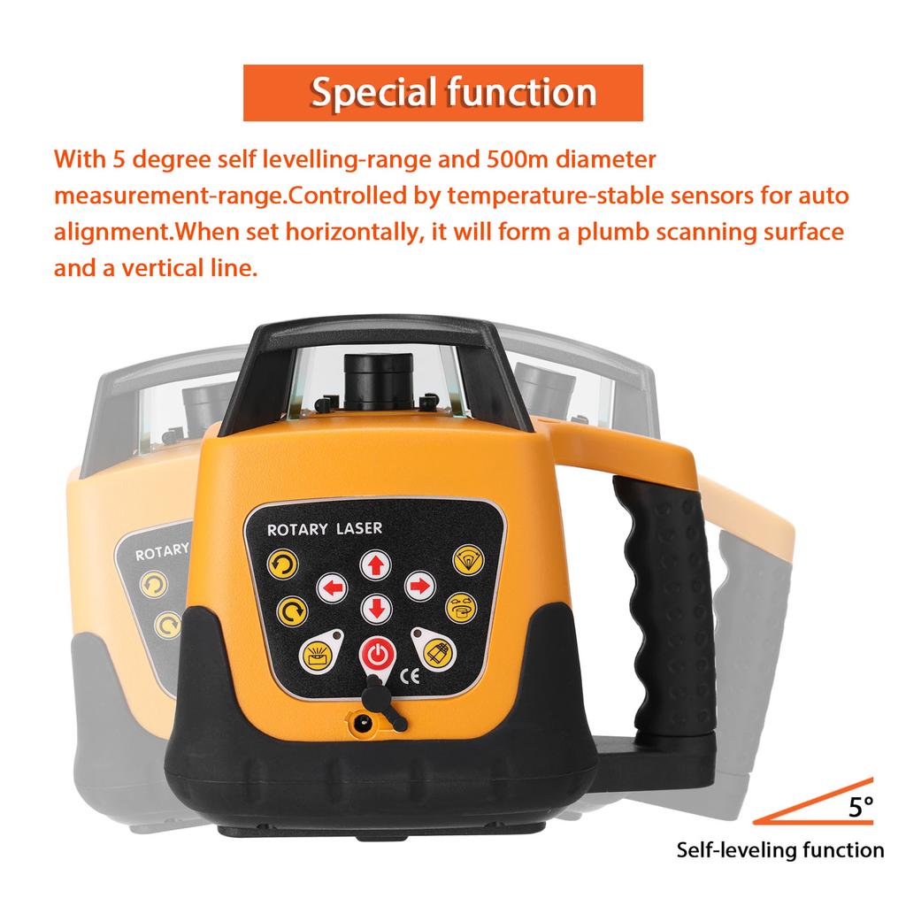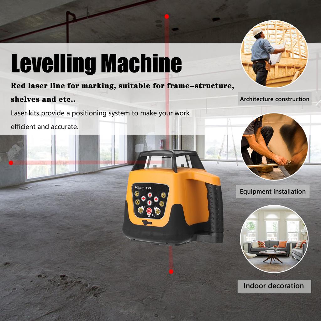 Этот лазерный выравнивающий станок будет отбрасывать 635 нм красный видимый лазерный луч для выравнивания позиционирования высоты лазерного луча. Он имеет рабочее расстояние 500 м и функцию поворота на 360 ° с четкими, яркими и стабильными линиями. С диапазоном самовыравнивания 5 градусов и диапазоном измерения диаметра 500 м. Два режима работы дизайн, регулируемый направление вращения, регулируемая скорость, регулируемый угол, и все функции могут использоваться с пультом дистанционного управления.