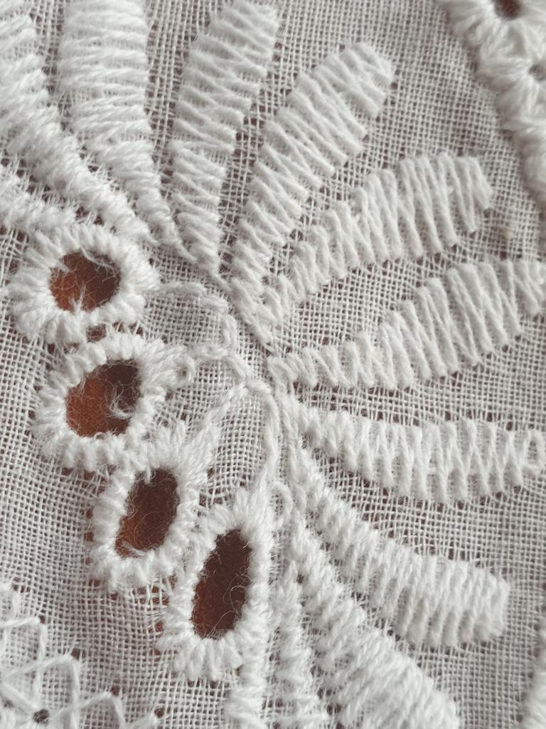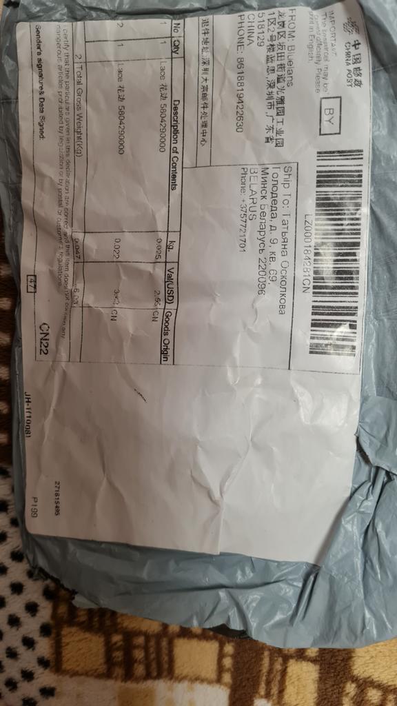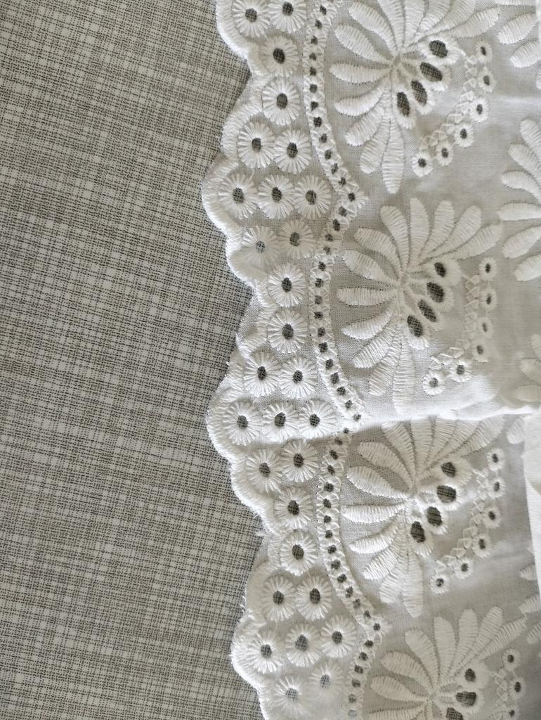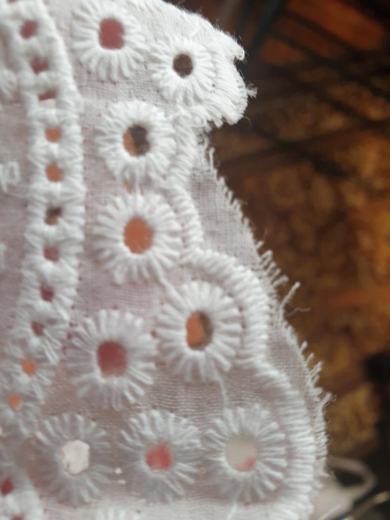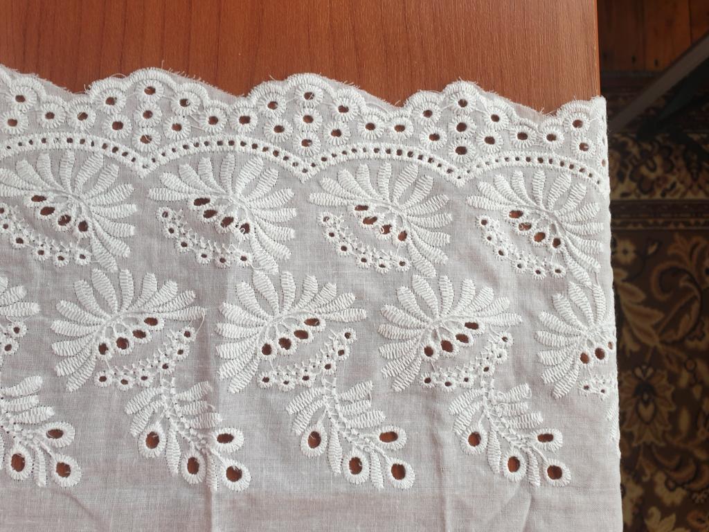 Всем привет! Получила кружево, ткань хлопок. Заказывала 3 ярда, получила 2,7 метра. Спасибо продавцу, за то, что отправил одним куском, не резал 👍🌷😀 Заказывала 20 февраля, до таможни посылка добралась 3 апреля, где-то гуляла по Китаю ))), это огорчает🤨 в пункте выдачи была уже 9 апреля, после таможни 6 дней - это радует 😃 По качеству есть вопросы. Кружево не доделано край фестонов не обрезан, нужно еще над ним поработать,🪡🧵🧷 чтобы использовать в изделиях. Зигзаг редковат для ришелье. Но в целом, на расстоянии этого не видно )) и смотрится хорошо. Смотрите фото и наслаждайтесь 😉 Надеюсь отзыв был полезен !