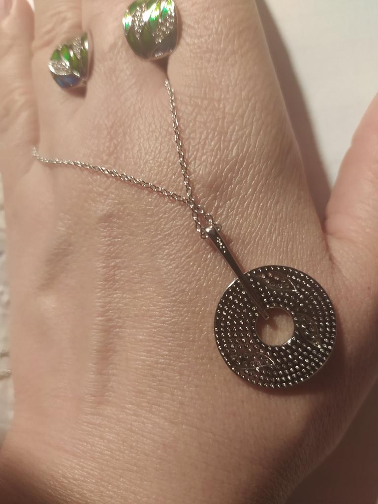 Подвеска красивая , но думала она более объемная и массивная .Диаметром 2.3 см диаметром и толщиной 2мм .К подвеске идёт цепочка длиной 45см. На фото продавца она выглядит более объемно чем в реале. В целом рекомендую.
