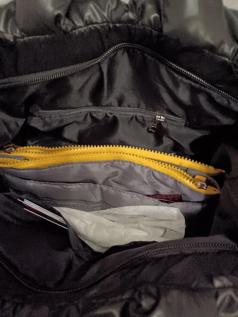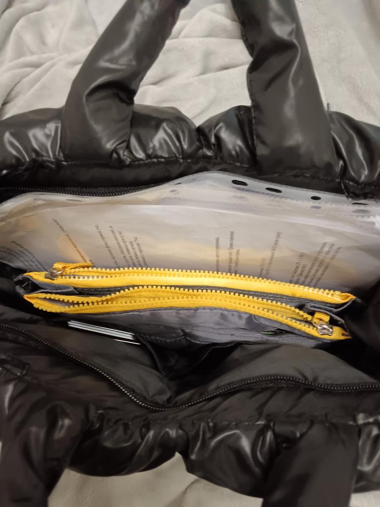 Отличная сумка! Очень интересная модель! Все, как на фото. Не слишком большая, но очень вместительная. Внутри кармашек на молнии и два небольших с другой стороны. Если не застегивать на замок, то одну из двух пар ручек можно убрать вовнутрь. Ткань типа плащевки, не клеенка. На черный цвет, конечно, все липнет, попробую обработать антистатиком.