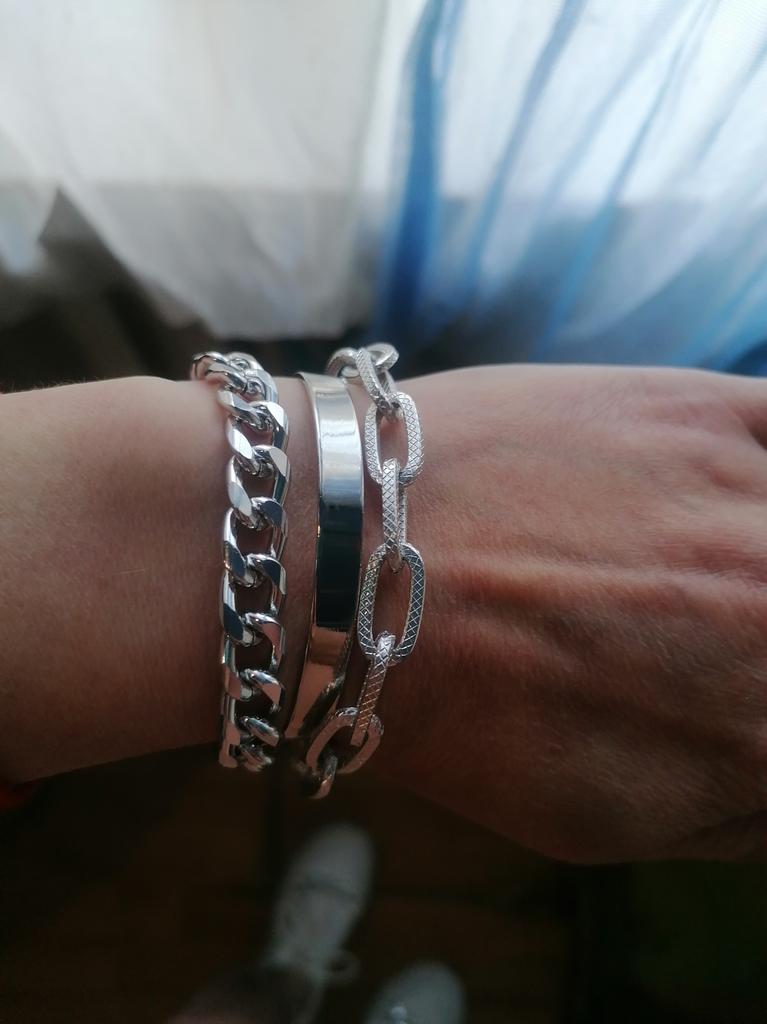 Очень понравились браслеты, особенно два из них, третий, с большими звеньями, не металл- это крашенный пластик. Для моей худенькой руки очень хорошо подошли, обхват запястья- -12 см. Рекомендую. Покупала за 175 р.