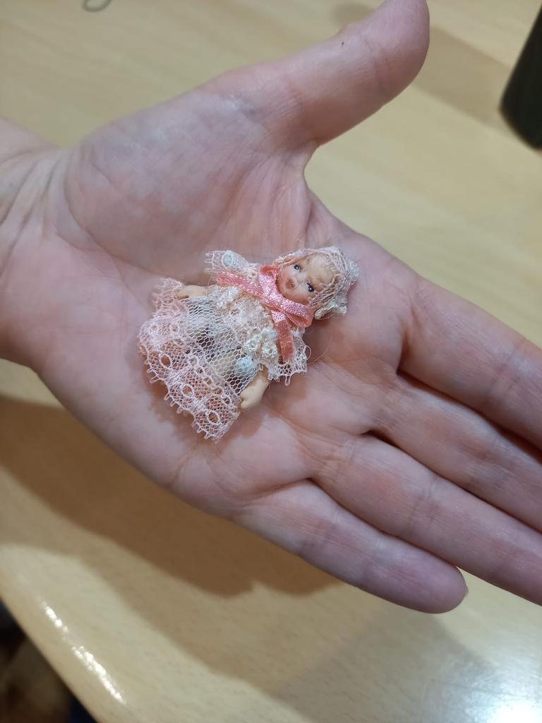 Миниатюрная куколка 5-6 см., но при этом хорошо прорисовано лицо, подвижные конечности, платье из кружев.Очарование! Спасибо всем. Рекомендую.