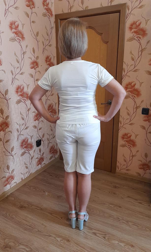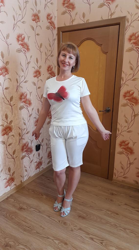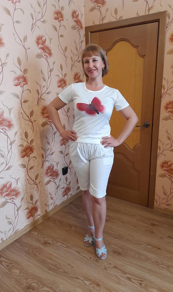 Очень милая летняя футболка 👕. Крой простой:прямая,короткий рукав, О-образный вырез горловины, длина средняя. Футболка 👕 белая с красивой бабочкой на груди. Цвет яркий как на фото продавца. Материал полиэстер, мягкий, лёгкий, тонкий, приятный к телу и на ощупь. Ткань не просвечивает, не мнется, не электризуется, хорошо тянется. У продавца широкая размерная сетка от М до 4XL. Футболку брала дочери на параметры :ОГ 78,ОТ 65,ОБ 85,рост 1,60. Но мне тоже подошла. Ну,конечно, себе я взяла бы XL . Мои параметры:46р, ОГ 94,ОБ 98,рост 1,65. Качество хорошее:швы ровные, аккуратные, нитки не торчат, запаха нет, дефектов не имеет. Рекомендую, красивая, лёгкая футболка 👕 пригодится в