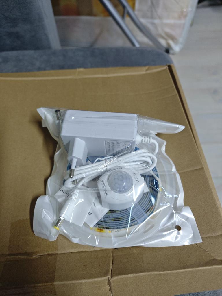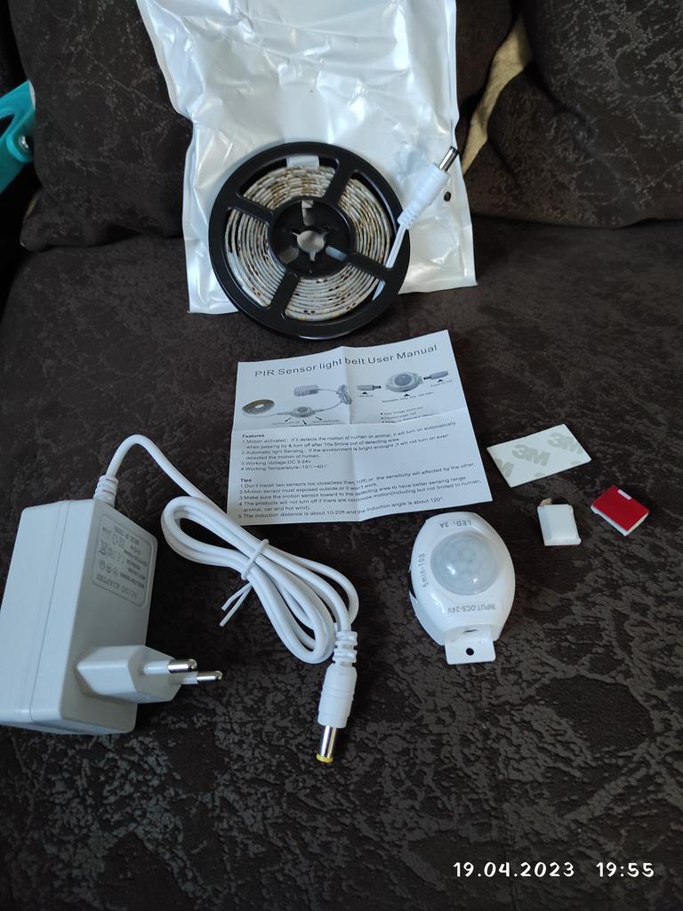 Подсведка оболденная,в комплекте две липучки на диодную ленту,хотя вся лента тоже на скотче+скотч для датчика движения,мануал для сборки,регулировка продолжительности свечения ленты от 5сек. до 5 минут,одним словом вещь