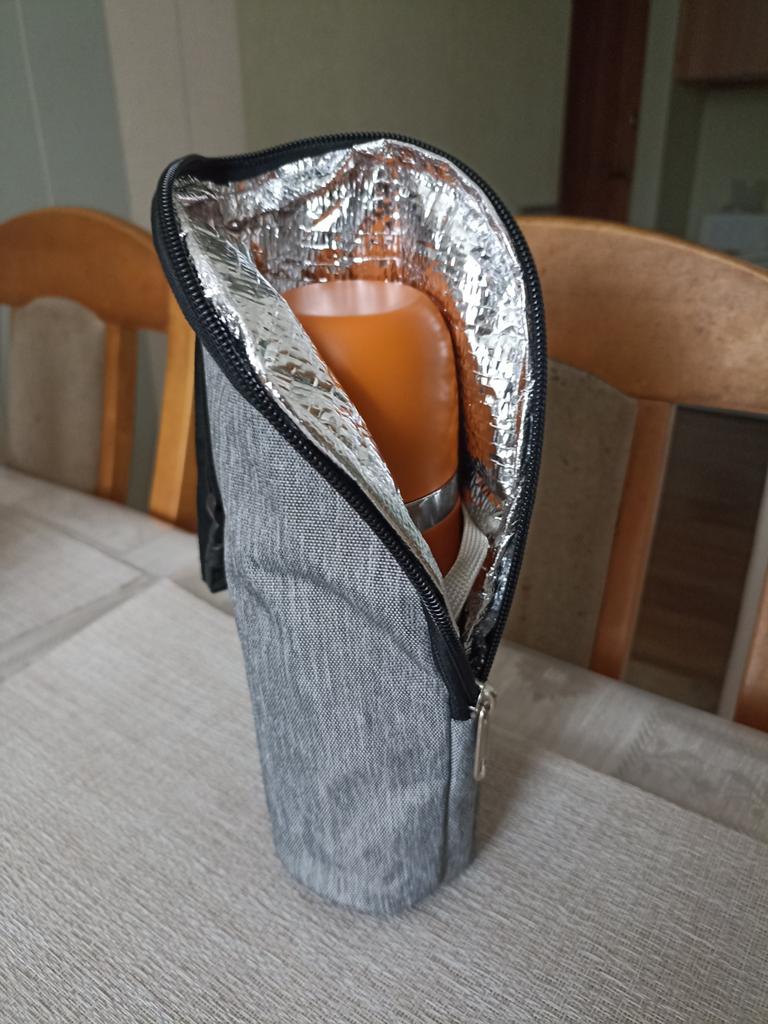 Уже использовала. Хорошо подошел по размеру к моему термосу. Прекрасно поддерживает температуру. Как я езжу на велосипеде - пристегнуть к небольшому рюкзачку в дорогу - идеально.