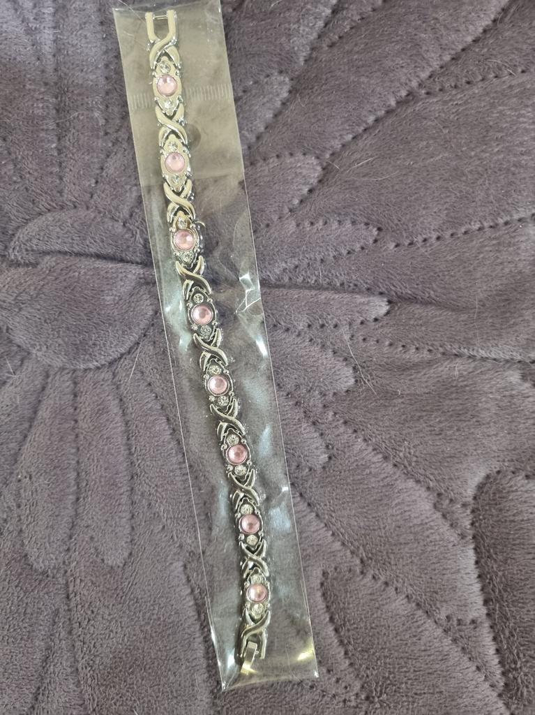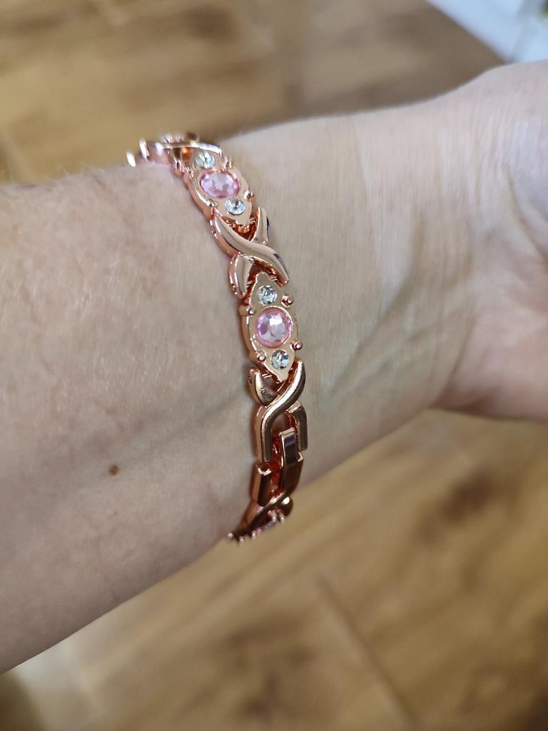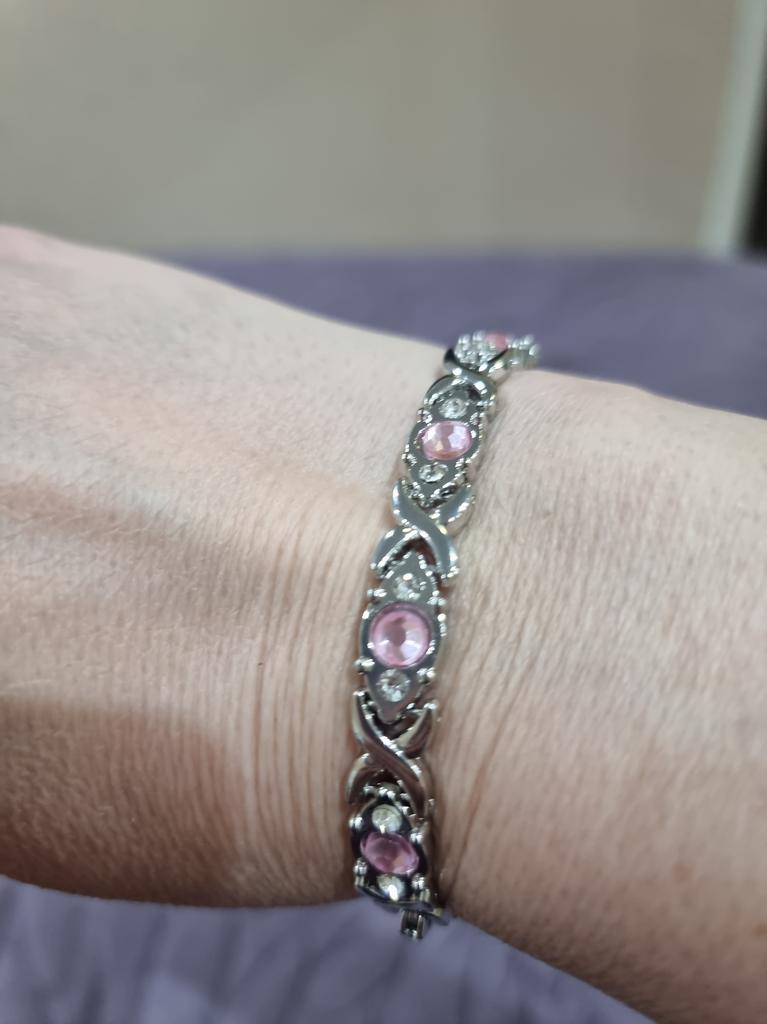 Камушки не такие яркие как на фото. Позолота начала уже темнеть и на стыках облезает. Но издали смотрится красиво. Носить буду конечно.И не знаю как там с магнитами, но браслет ни к чему не магнитится. Может там конечно защитное покрытие. Не очень он мне понравился. Посмотрим , как с похудением будет.