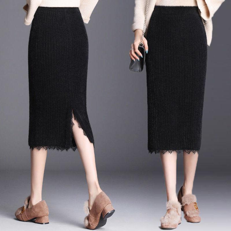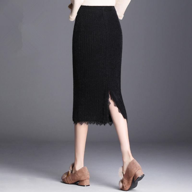 Осенне-зимняя женская трикотажная юбка миди, женская юбка с высокой талией, плотная искусственная норковая бархатная кружевная тонкая юбка на один шаг
