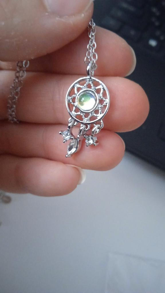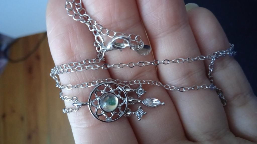 кулончик очень интересный) небольшой, но я люблю небольшие украшения) на цепочке повешена проба, посмотрим, будет ли темнеть) камень, конечно, не лунный, уже видела здесь такие камни, смотрится неплохо, на свету переливается)