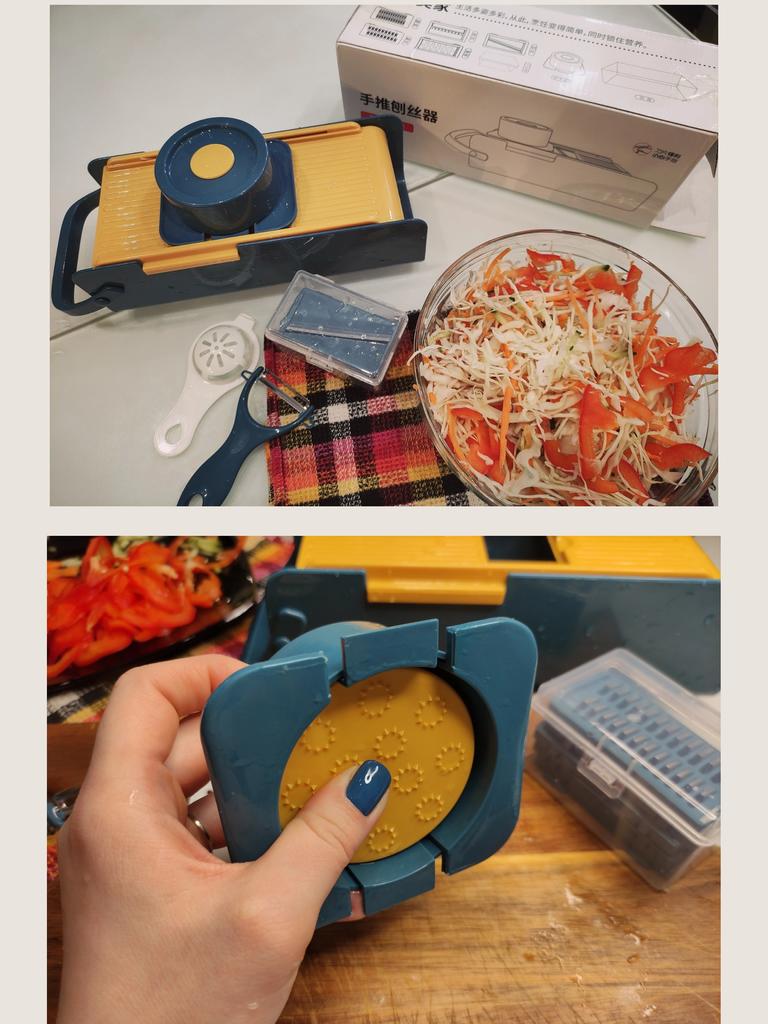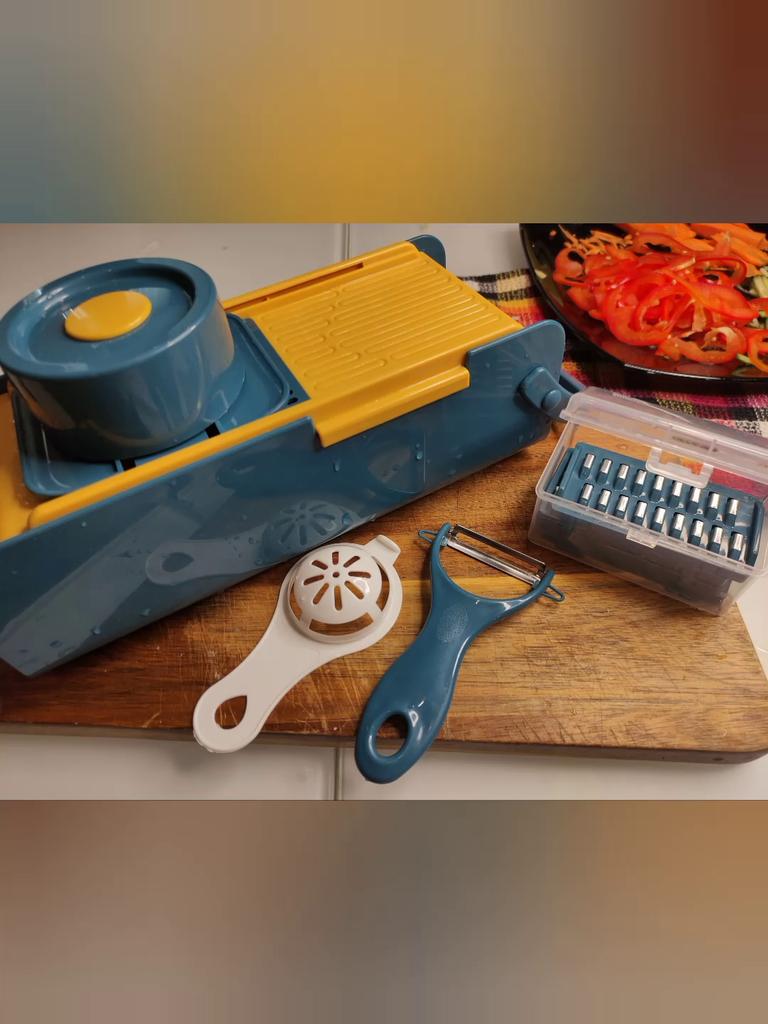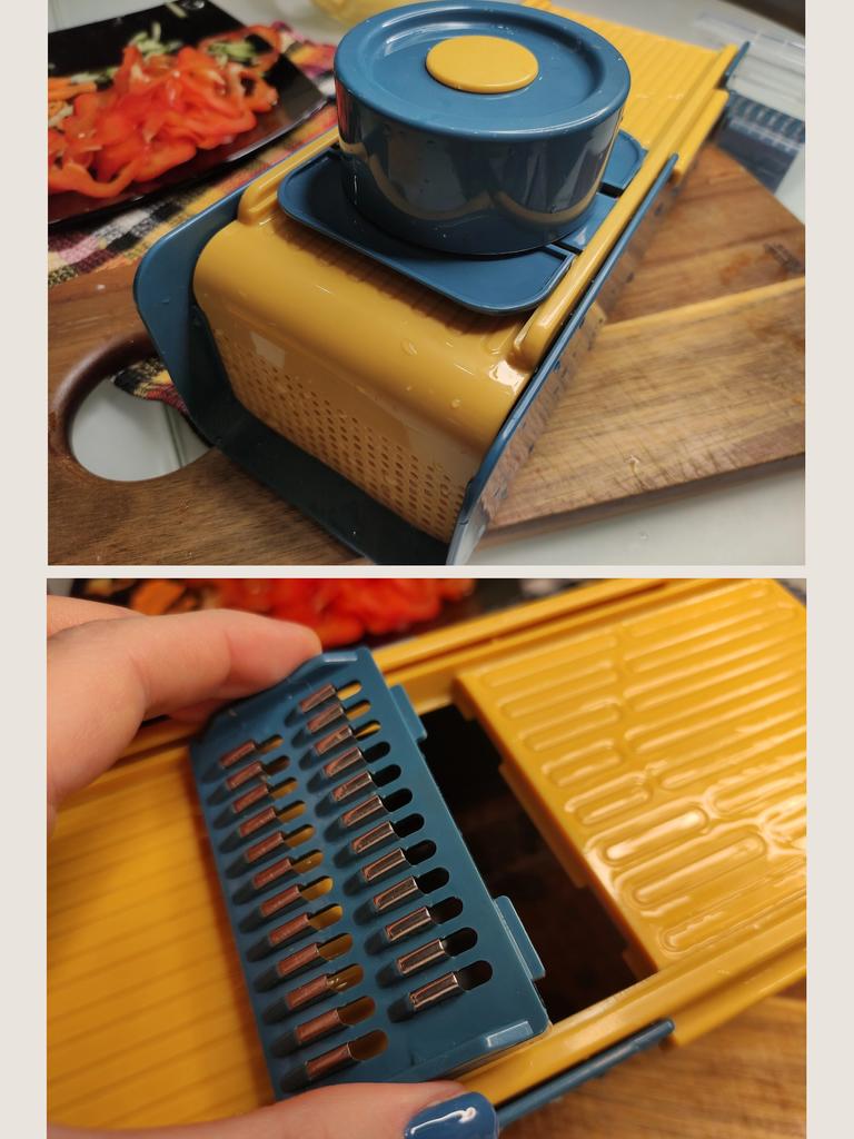 Как же я давно мечтала о такой терке🤗, и что бы хорошая и острая, и пальчики чтобы были в безопасности. Покупка удалась на все 200%, когда испробовала её, так радовалась, аж пищала💃 от восторга. Всем моим пожеланиям терка угодила, я салат овощной режу час, а картошку для по-французски 2, ненавижу эти два блюда только из-за того, что резать долго, так ещё ж тонко надо, а теперь за 5 минут всё, что угодно, ура 🙌! Обязательно посмотрите все видео, я старалась полностью передать её функционал, и не забудьте 💕. 📍 Мульти терка включает в себя: терка с прозрачным контейнером внутри, фиксирующая насадка с проталкивающей вставкой (безопасная), 5 разных режущих насадки + прозрачный контейнер для их хранения, нож двухсторонний для чистки овощей, и мульти ложечка. ✔️ Овощерезка с прозрачным контейнером: качество шикарное👌, пластик пищевой, не токсичный, качественный, плотный, толстый, без дефектов без запаха. Предусмотрено всё, легко собирается и разбирается, имеются отверстия для слива воды. Есть подставки и 2 вида ручек. Одна ручка регулируется, за неё можно держать терку в процессе или подвесить для хранения. Вторая скрытая снизу. ✔️ Лезвия 1 для сока/пюре и 4 штуки для шинковки так-же, качественные, металл👍 нержавеющий, не тонкий, ооочень острые , надо отдать должное, шинковать одно удовольствие. Виды шинковки описывать не буду, посмотрите 4 фото. Огромный плюс, что для хранения лезвий есть отдельный закрывающийся контейнер. Лезвия сидят крепко, не выпадают. ❗Не советую лезвия мыть в горячей воде, так они быстрее затупляются. ✔️ Очень удобная защитная насадка, легко скользит, чтобы её вставить просто слегка сожмите по бокам. Насадка действительно удобная и имеет проталкивающий механизм. Состоит из двух частей, вначале можно использовать без крышки для таких овощей как огурец или морковь. ✔️ Овощечистка маленькая, да удаленькая, легко чистит в обе стороны. В руке лежит удобно 👍. ✔️ Ложечка - дуршлаг, она помогает снять лезвия с основы без усилий, идеально подходит для яиц, да и всегда пригодиться на кухне. 📍Хочу отдельно заметить, что мыть терку одно удовольствие, не надо прикладывать усилия, я ни разу не воспользовалась губкой 🙌. Кстати можно мыть в посудомойке. 📍 Также я обратила внимание, что терка достаточно устойчивая и крепкая, ни чего не ездит и не вываливается, не разваливается, был у меня предыдущий неудачный опыт. 📍 Удобное хранение, так как всё что в комплекте, помещается внутри терки. Резюмирую❤, я в восторге! Однозначно рекомендую💯, трека супер классная, быстро справляется со всеми овощами, простая в использовании👌, легко моется. Пользуюсь в итоге, практически каждый день, чаще 😆чем планировала. Теперь не стоит вопрос времени, так как она мне его очень экономит. Я ни разу не пожалела о покупке, ещё и маникюр целый🤣💯👍. Обнимаю 🤗 #Ксю !