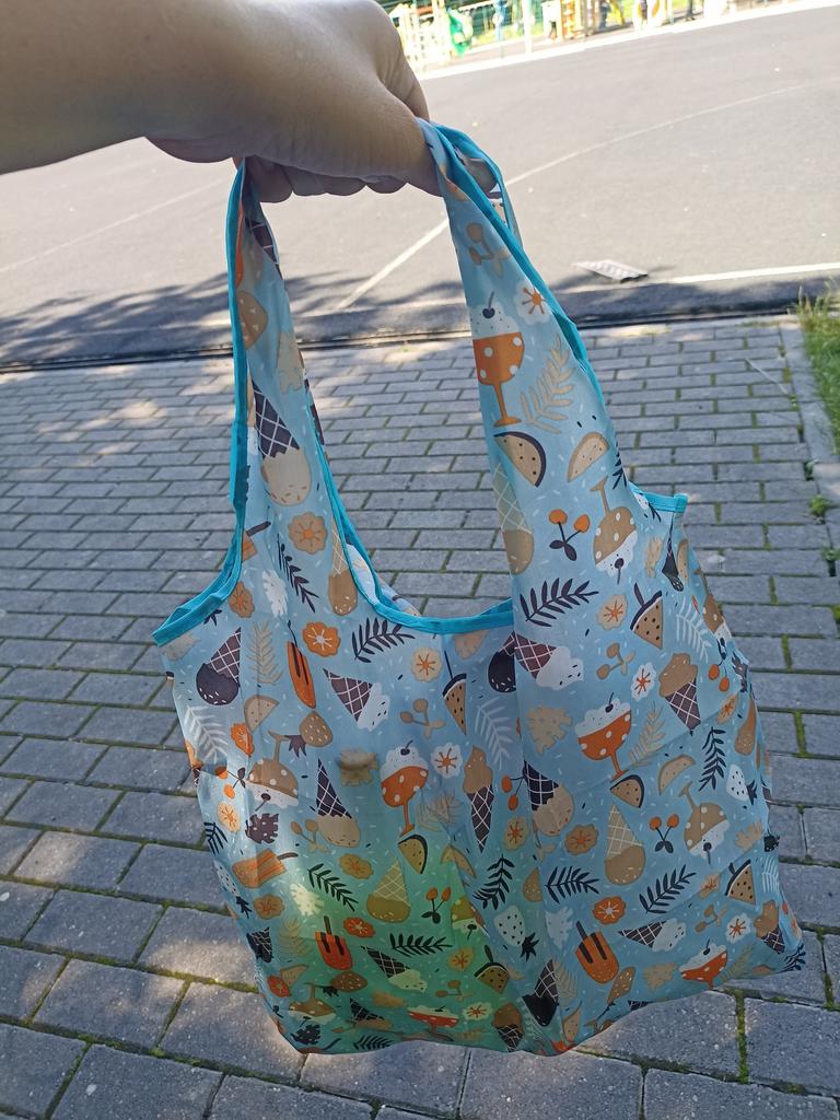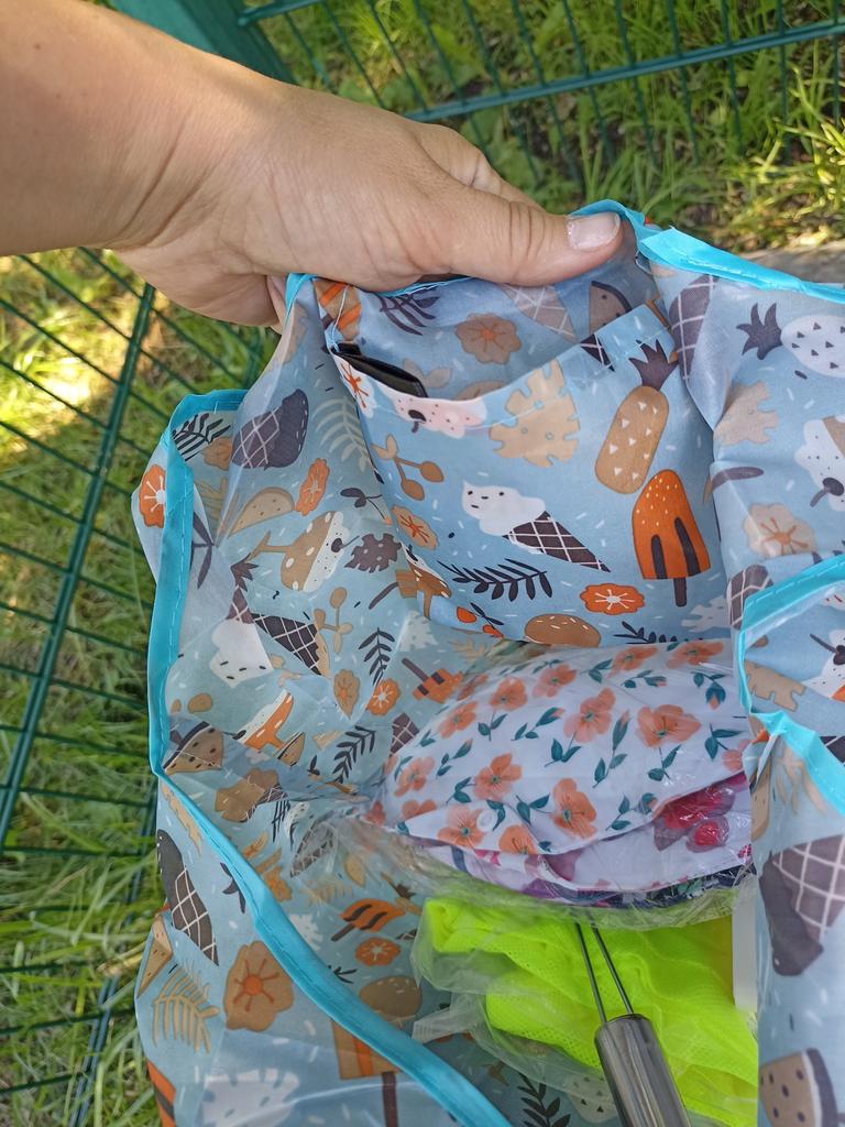 Хозяйственная сумка из болоньи. Сумка складывается в небольшой конвертик, похожий на кошелек. Занимает мало места. Удобно носить в небольшой дамской сумочке, а в нужный момент развернуть и использовать. Достаточно вместительная. Грибов вошло точно больше, чем 10-литровое ведро. Ручки длинные и широкие, можно носить на плече. В Беларусь прибыла за месяц.