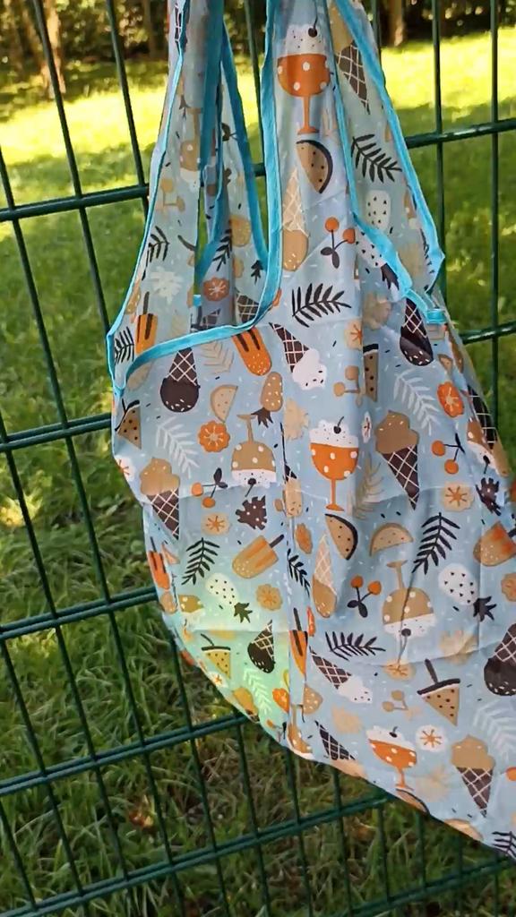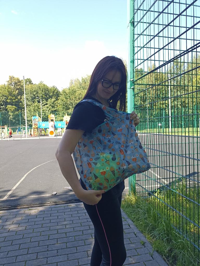 Очень люблю такие невесомые сумочки для покупок. У меня есть подобная, но меньше по размеру. Эта сумочка упаковывается в небольшой плоский конвертик, что очень удобно для дамских сумочек и клатчей. Когда раскладываешь- этот конвертик можно использовать как дополнительный кармашек,например для чупа чупсов)))Запаха совсем нет. Кое-где торчат ниточки, но швы все прошиты ровно и аккуратно, так что это не критично -просто срежу. Очень милый принт, прочная ткань. Советую ! Отличная сумка! Доче тоже понравилась ей закажу с арбузиками)))