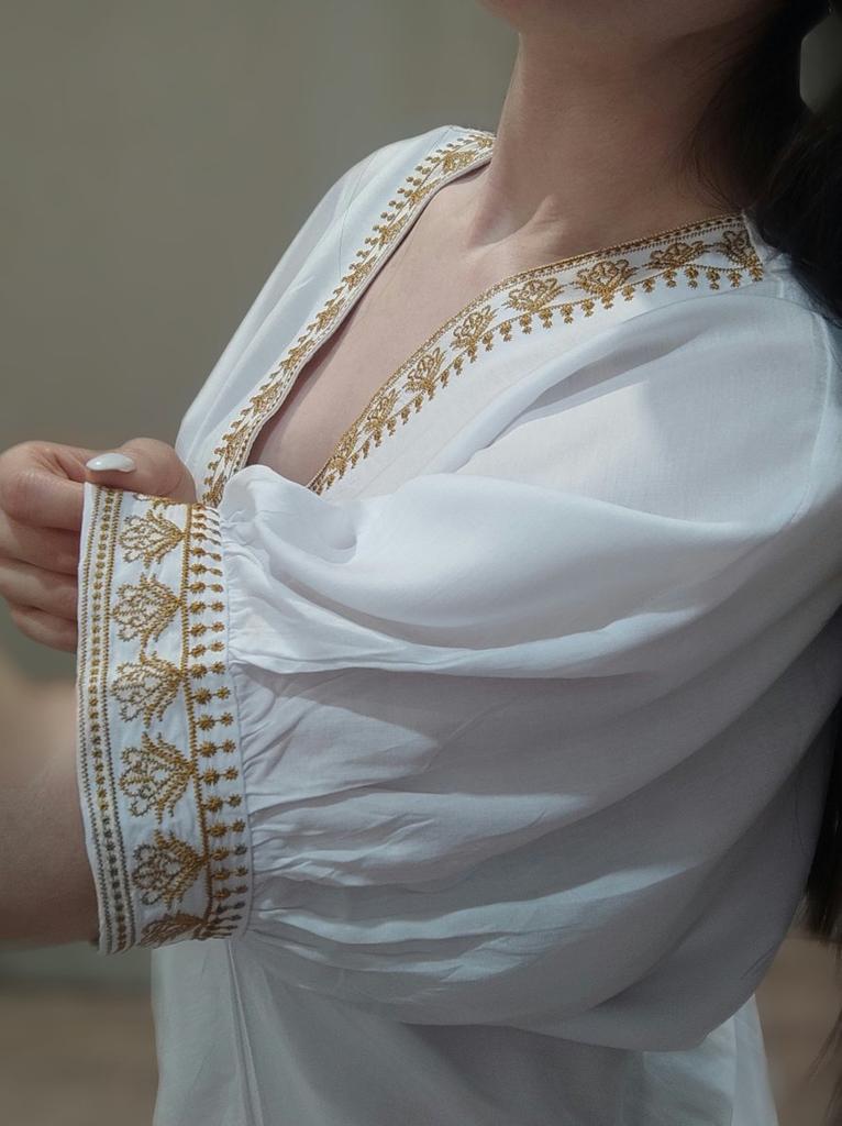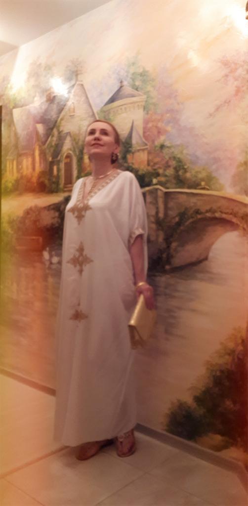 Белая хлопковая пляжная туника с золотой вышивкой на высокий рост Такая воздушная, из натурального хлопка. То ли греческий стиль, то ли немного восточный, как считаете вы, смотря на вышивку?) Очень добротная туника, в которой и от солнца можно спрятаться и при этом не ужареть. Ткань немного полупрозрачная, на солнце будет виден купальник под низом. Вышивка машинная, ровненькая. Всё пошито тоже достойно, но надо обрезать торчащие нитки. Боковой шов без разрезов до самого низа. Туника безразмерная (обхват груди 167 см), длинная - по косточку на щиколотке при моём росте 169 см. Очень хорошая длина, кто с таким же примерно ростом - приглядитесь. К покупке рекомендую! 👍