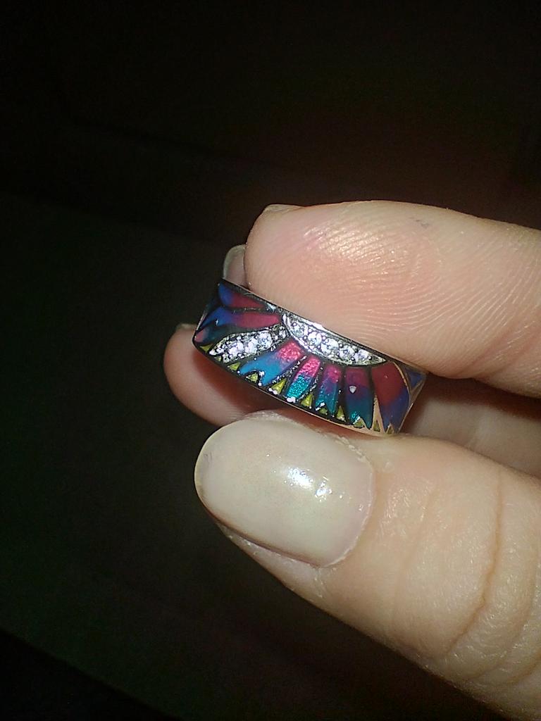 Очень красивое колечко.Сделано аккуратно,все камушки на месте и эмаль яркая. По размеру подходит.На внутренней стороне стоит проба 925,хотя за такие деньги очень сомневаюсь,что оно серебряное.