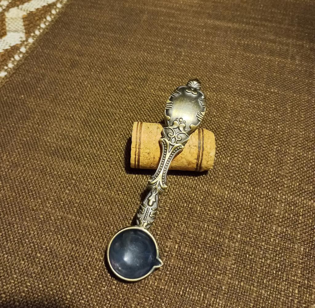 Ложка - произведение искусства! Ну, о-очень красивая. Приятно держать в руке, правда, греется, если дольше подержать над пламенем (а иногда приходится, чтоб разные цвета смешались) . Для моих нужд чуть мала по объему, мне нравится, чтоб печать получалась толстенькая, не " прозрачная", кладу 5- 6 таблеточек.Для этой ложки- запредел. Но на 3- 4штучки - самое то :))). Думаю, такая прекрасная винтажная штучка хорошо послужит мне, как ложечка для специй, люблю на кухне всякие "прибамбасики".