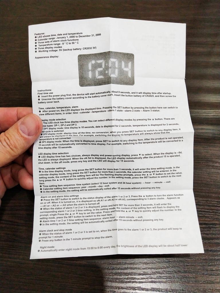БЮДЖЕТНЫЕ СВЕТОДИОДНЫЕ ЧАСЫ Миниатюрные часы, работающие от сети, в этом плане не удобны....а также нумерация часов только до 12.... Три функции: часы, будильник и температура воздуха Инструкция на английском и китайском языке С помощью тыка в настройках разобрали В комплектацию входит: часы, шнур без вилки и инструкция