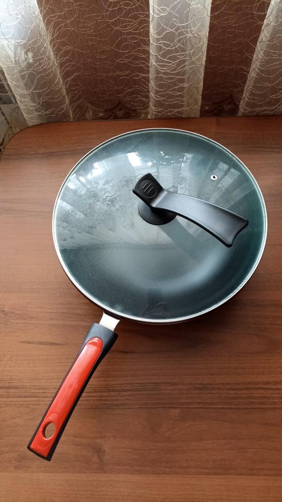 Сковорода со стеклянной крышкой, антипригарная из нержавеющей стали. Диаметр 30 см, в реале 33 см. Материал -черная углеродистая сталь. Сковородка соответствует всем параметрам. Благодаря отличной упаковке ( плотная коробка) , товар дошёл в целости и сохранности. Сковорода глубокая, с хорошим покрытием и плоским дном, подойдёт как для газовых плит, так и индукционных. Ручка для крышки пришла в отдельном пакетике, собирается легко. Сковорода просто супер, отличный семейный вариант, довольна очень-очень, тем более, что на время покупки со скидкой она стоила 890 рублей, сейчас цена хорошо подрасла. Доставка два с лишним месяца, но она того стоит, продавцу спасибо за качественный товар.
