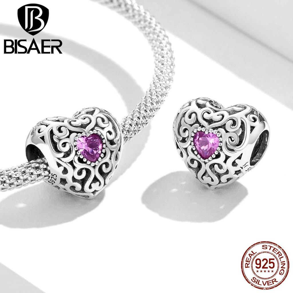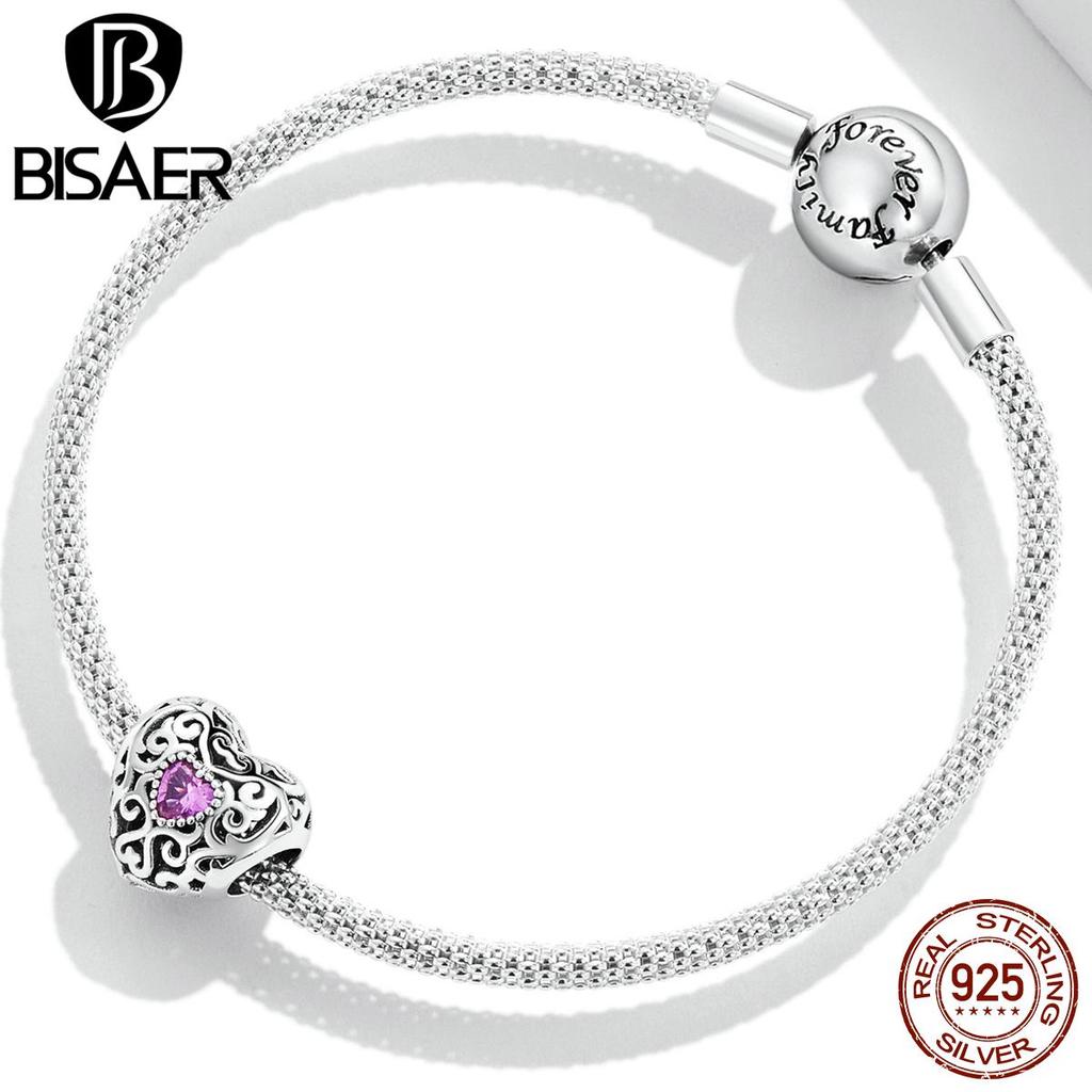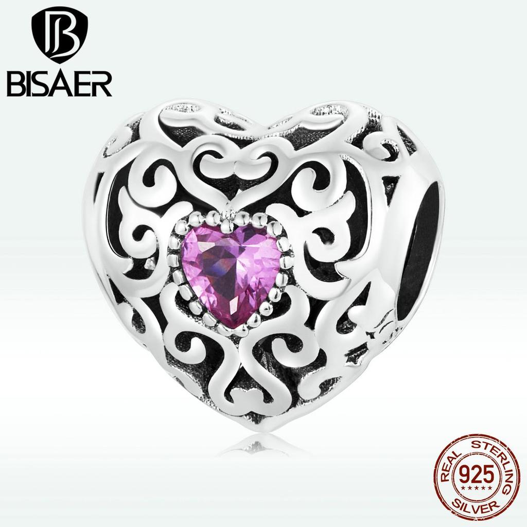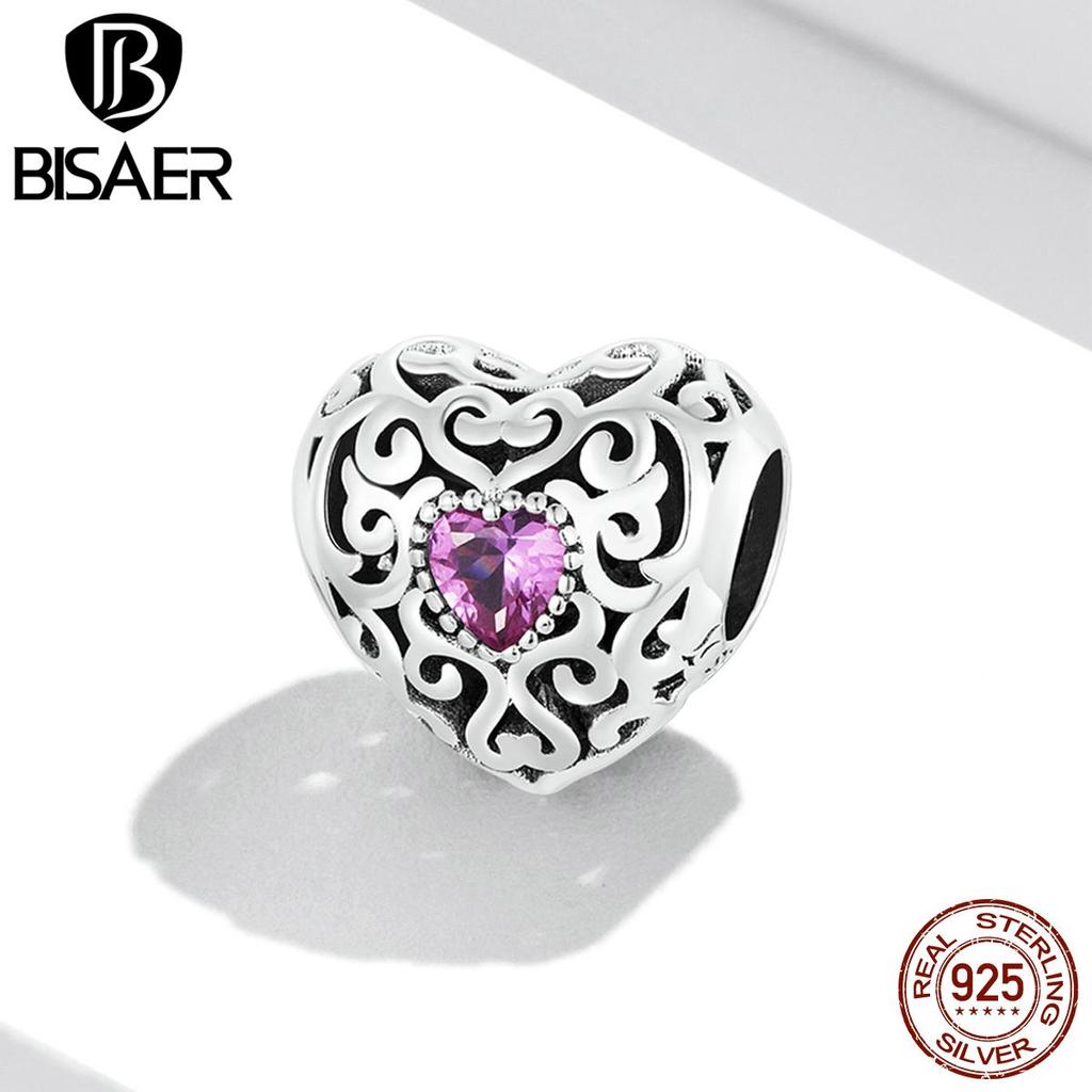Bisaer Подвески в форме сердца Vinatge, стерлинговое серебро 925 пробы, полое сердце с розовыми цирконовыми бусинами для женщин, браслет, ювелирные изделия, подарок