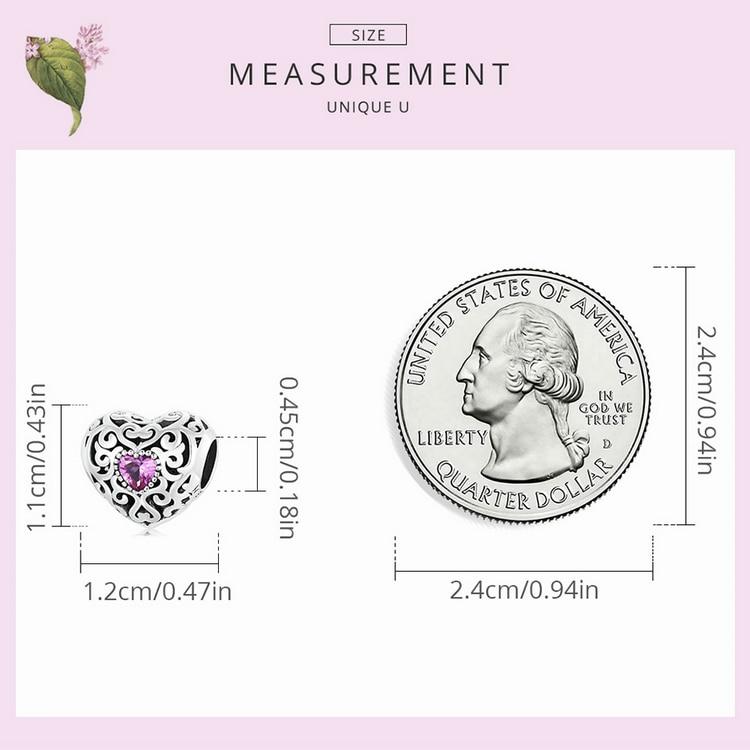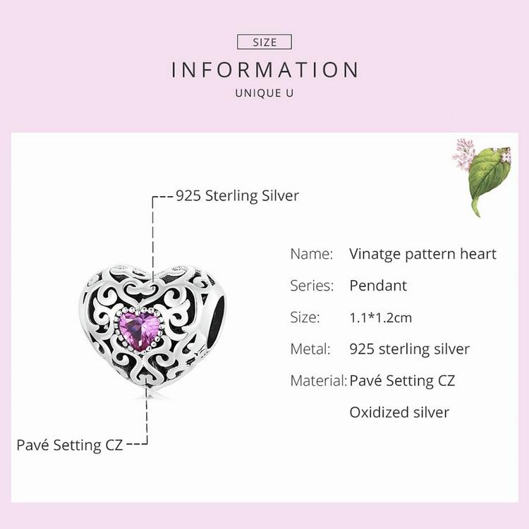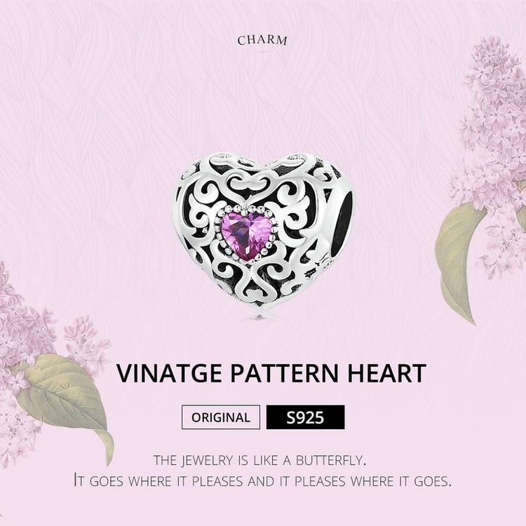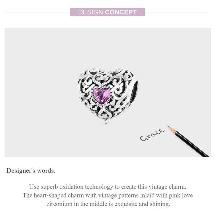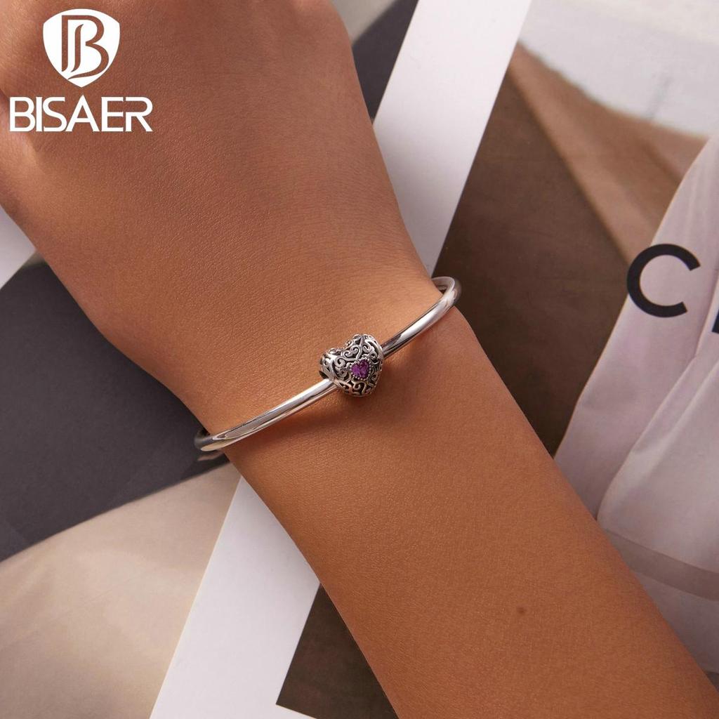 Bisaer Подвески в форме сердца Vinatge, стерлинговое серебро 925 пробы, полое сердце с розовыми цирконовыми бусинами для женщин, браслет, ювелирные изделия, подарок