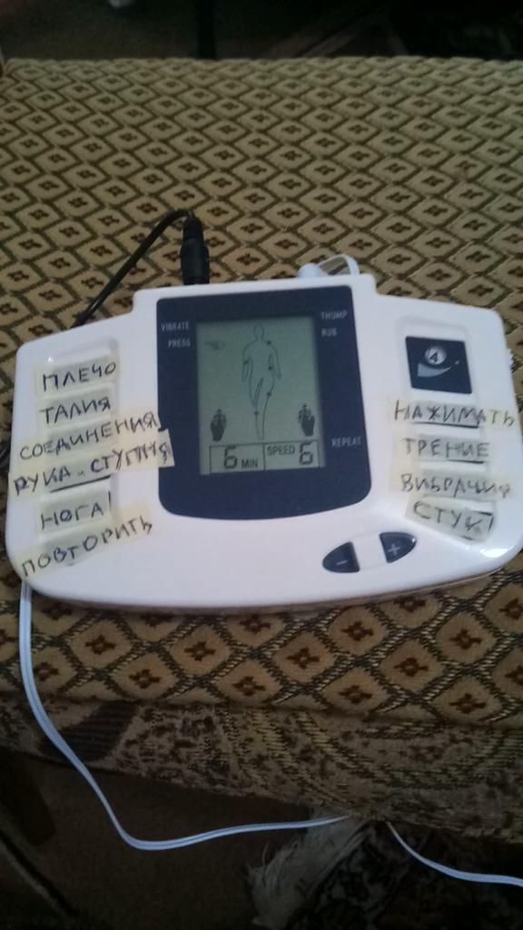 Посылка дошла в хорошем состоянии (за 18 дней до Молдавии). Подключил, лампочки-индекаторы зажглись. Работу с подключенными электродами пока не проверял. Надо разобраться с переводом названий кнопок. На аппарате надписи на английском. P.S. Пишу спустя пару часов после вышенаписанного: Прямо сейчас сижу во время работы аппарата. Почти все функции работают хорошо, но одна кнопка (REPEAT) всё таки не работает 😞.