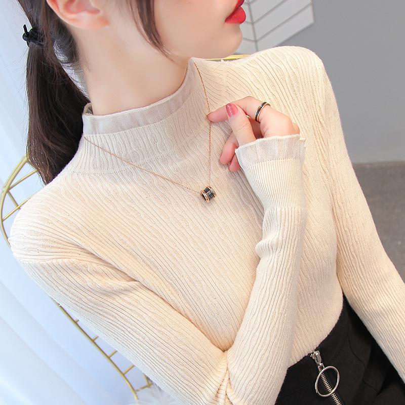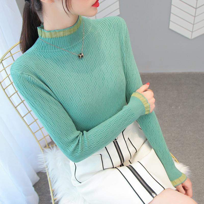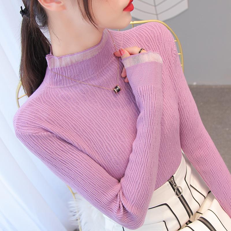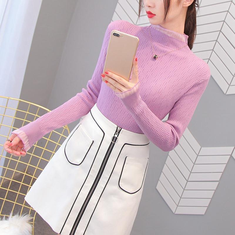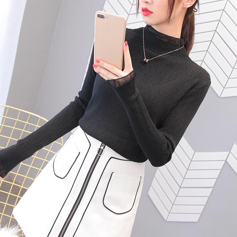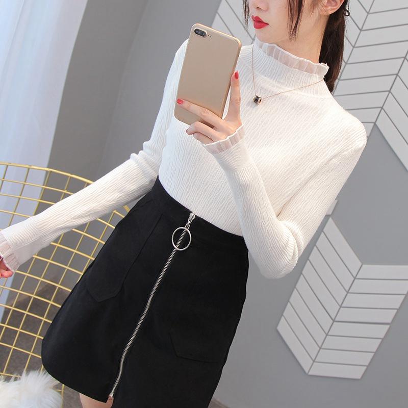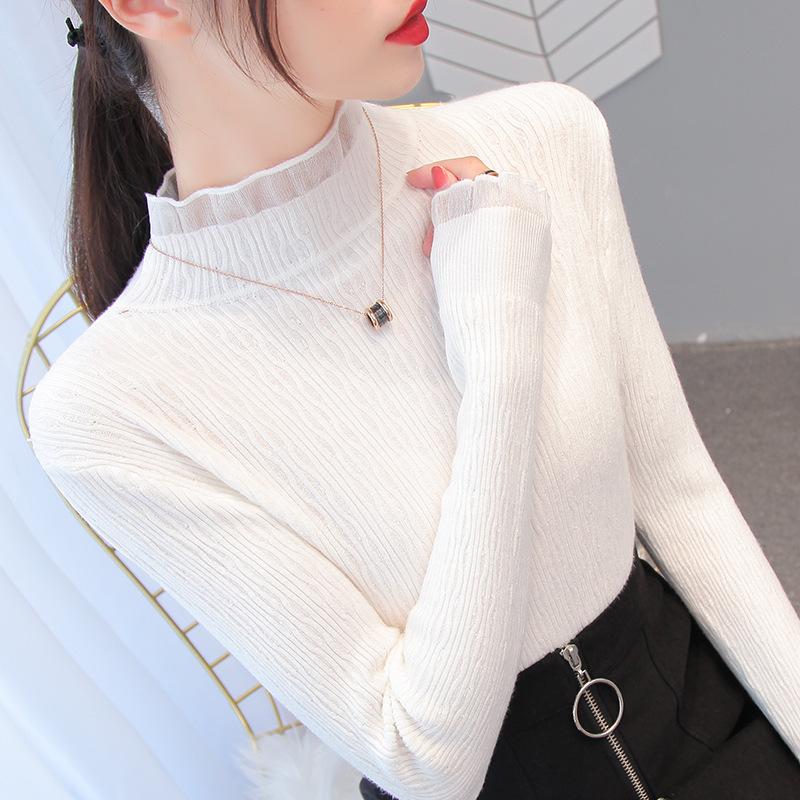 Женские весенне-осенние пуловеры, вязаные свитера, рубашка-грунтовка с длинными рукавами, кружевные тонкие топы с высоким воротом и рюшами, сплошной цвет, один размер