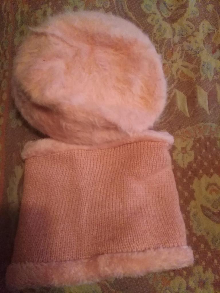 Неплохой вариант для осенние-зимнего периода с небольшим морозом. Мягкая пушистая шапочка и плюс шарфик. Длину шарфа можно регулировать, при необходимости закрыть им нос или, наоборот, распределить по шее пониже ( имеет форму кольца, шов сзади на шее). Оба изделия на подкладке в тон. В моем случае ворсинки на подкладке изделий немного слежались во время дороги, но это не критично, после обработки расческой все пришло в норму.