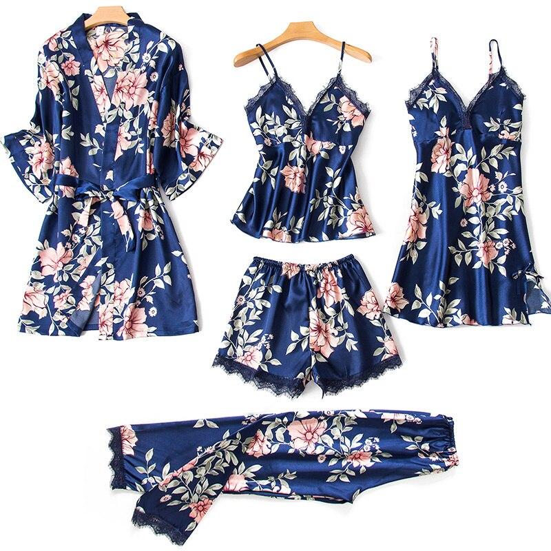 5 шт., женский пижамный комплект из ледяного шелка с принтом, модная пижама с нагрудником, кружевная пижама с v-образным вырезом, одежда для сна