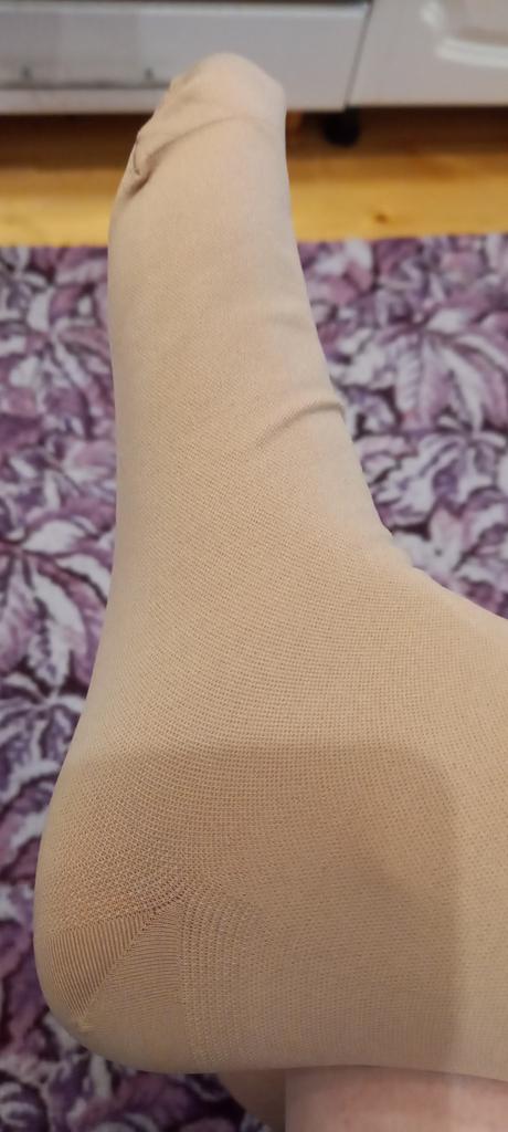 Длинна хорошая на длинные ноги. Отличный след на стопу 24.5-25см. Мои размеры 24 42 64, высота 80см. Недостаток что в голеностопе компрессия недостаточная, а в колене и бедре сильная. Такое чувство что не правильно распределена. На фото видно что по стопе и голеностопе свободно. На попке предусмотрен объем, поэтому не плющит. Ластовица не стандартная, широкая, поэтому на бедре видно что пережимает и не тянется из-за шва. Посадка на уровне талии. Трикотаж рыхлый. Все качества сравниваю с венотекс и меди. К этим надо приспособиться и самой распределить трикотаж по ноге, иначе пережмет в паху и будет трындец. Оценку снизила за качество трикотажа и ластовица, если её делать ниже чтобы не давила, то и колготки на поясе скатываются до пупа. Мне надо чтобы сидели чётко на талии, а если ниже, то это не мой вариант ношения изделия.