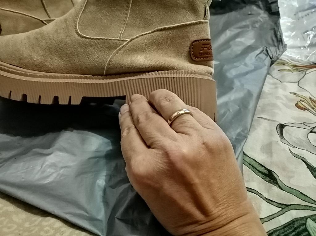 Так ждала эти ботинки, но... пришли повреждёнными! Это халатность сборщика посылки, обувь была упакована валетом в просто пакет!!! Ни коробки, ни даже пупырки, ни полноценного вкладыша в обувь против сминания! Как это?? Результат - пяточная часть, задник замят безвозвратно, при попытке выправить изнутри заломы стремятся обратно, даже в надетом на ногу состоянии! И это при том, что свободы ноге внутри нет, размер впритык, пятка плотно сидит в ботинке! И заломы поддавливают и подтирают ногу! 39 размер только-только на мой 36-36.5! Верх ботинок не искуственная кожа, как заявлено в описании, а трикотаж под велюр! Холодные, не на зиму, вообще, даже на относительно теплую... Разочарование полнейшее! Не повезло... Рекомендовать данного продавца не могу!
