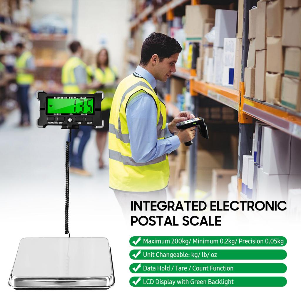 Электронные почтовые весы подходят для отправки посылок. С 200 кг (440 фунтов) емкость, точность 0,05 кг и ЖК-дисплей с подсветкой, это удобно для вас, чтобы читать и работать. Это также